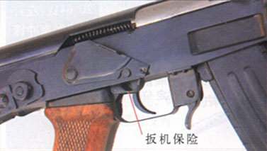 该枪设有到位保险、安全保险和行军保险。到位保险由带有固定击针的枪机完成。在正常情况下,只有枪机复进到位,击针才能撞击底火而形成发射。安全保险扳把位于握把右上方,当向前扳动扳把到位时。它位于扳机的后方,挡住扳机使之不能扣动而完成手动安全保险。