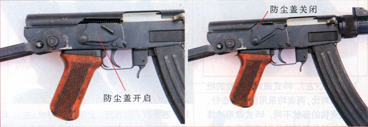 机匣右侧的防尘盖向上关闭时,可遮盖机匣与机匣盖之间的拉机柄通道,起到防尘的作用。在防尘盖关闭的同时,防尘盖轴上的凸轮带动轴固定板向上旋转,刚性顶住枪机使它不能后退而起到行军保险的作用。