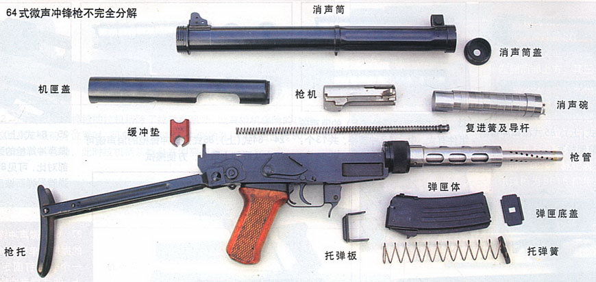 资料来源: 《轻兵器》1996年第3、4期[1964年式微声冲锋枪]黄友宗 《轻兵器》2006年第1期上[中国1964年式7.62mm微声冲锋枪全功略]曾振宇、袁炜 《轻兵器》2008年第4期下[中国侦察兵手中的利器:64式7.62mm微声冲锋枪]秦延景 |