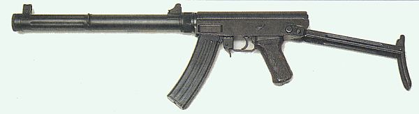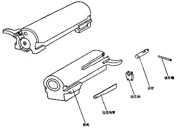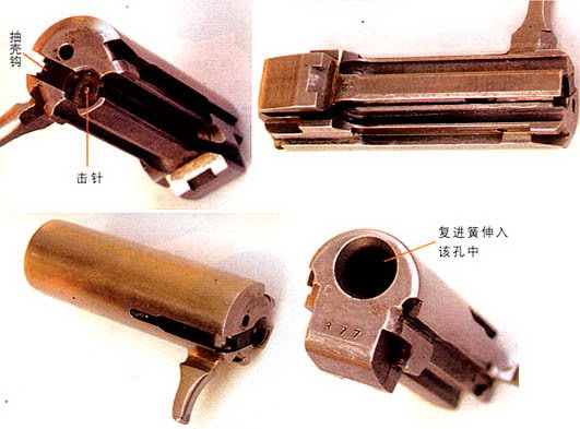 由于该枪采用开膛待击,因此击针是通过击针销固定在弹底窝中央,从枪机前端面凸出。枪机右上方装有平移结构的拉壳钩,拉壳钩簧为片状。上部有容纳复进簧的孔,后部左右两侧有导引运动的导轨。后下部有与阻铁扣合的斜面,右前部设有拉机柄部。由于击针固结在枪机上,依靠枪机复进前冲击发。单发时,枪机从阻铁扣合处复进完成击发;连发时,枪机从最后位复进完成推弹、输进弹后完成闭锁击发。