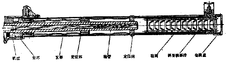 微声冲锋枪在结合时,先将套筒结合在机匣上,再旋转背环。因背环作用,使套筒上的断隔螺纹可靠地定位,以免套筒纵向松动。