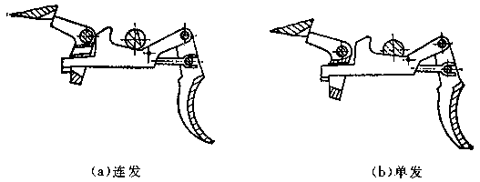 当单连发杆位于连发位时(a),其上的圆柱部压住变换挺,使其位置下降,它尾部的T形突起与阻铁T形槽下部平面有重叠量。当扣引扳机时,带动变换挺向前运动,从而带动阻铁旋转,使其头部下降,解脱与枪机的扣合而完成前冲击发。此时由于变换挺位置低,复进中的枪机压不到变换挺。这样,变换挺与阻铁继续钩合,使阻铁头部无法旋转上升与枪机扣合。枪机在击发后,由于火药燃气作用后坐到位后又复进。完成自动机工作循环,再次完成击发。如不松开扳机,依此工作程序将弹匣内枪弹发射完毕,枪机复进到位形成停射。如在连发过程中松开扳机,变换挺在扳机簧力作用下向后运动,此时阻铁也在阻铁簧力作用下旋转.其头部上升与复进中的枪机扣合,使枪机停在后方而中断连发射击。