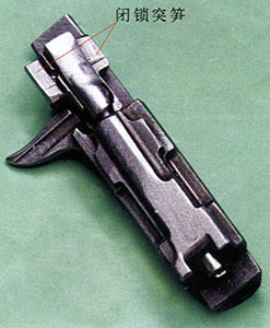 3.卡弹故障问题:手枪弹弹头为圆柱形,导引性能不好,但如果不受具体结构的限制,采用高位、小升角、短行程的进弹路线,用枪机直接推弹人膛的方法,只要弹匣内部输弹供弹设计得当,供弹及时性予以保障,一般卡弹故障出现得比较少。 由于79式采用机头前端回转闭锁结构,机头闭锁齿回转占据了枪管尾端后面的一大部分空间,迫使弹匣位置向下、向后,枪弹人膛需要走过一段“爬坡”路程,进弹行程过长,在半路上容易被卡滞。而 弹匣中第一发枪弹不抬头,特别是不抬尾也容易造成卡弹。在设计中经过多次摸索、分析原因,采用了严格控制甚至有意加大托弹簧最上一、二圈后部间距的办法,加大尾部托弹力,使卡弹故障大为减少。 当然,弹壳抱弹口宽窄与长短,对供弹初始位置影响很大,须加严格控制。在使用中切忌摔打弹匣,使弹匣特别是口部变形。