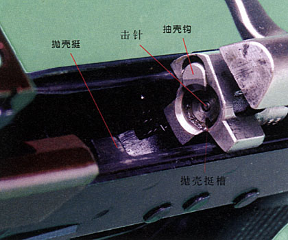 设计中除了尽量加大拉壳钩簧力及力臂外,主要严格控制拉壳钩对面距离和镜面距离,甚至采用了“偏方”——使枪弹“偏火”,枪弹被抱紧后处于0.25~0.3mm的偏心和13°的倾斜,以保证尺寸在下偏差的枪弹,也能被抱紧。大量试验证明,经过这样“综合治理”可以大大降低卡壳故障率。在实践中总结出了“抱得紧、抛有力、路线对”的经验。所谓“路线对”,指的是抛壳路线要正确,弹壳撞机匣盖的位置尽量靠弹壳尾部,以便更容易抛出枪外,不致于撞回枪内。