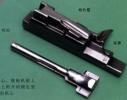 1.拉机柄断裂问题:79式冲锋枪理论射速在1000发/分钟左右,射速比较高。在高速震动、前后方撞击条件下,拉机柄的质量纵向分布必须外(稍)小内(根)大,以便尽可能地减小其转动惯量,这就是拉机柄设计得比较尖的主要原因。但这样一来就使拉机柄强度减小,而且由于末端稍尖,在快速操枪不注意时可能带来划破衣服或手指的弊端。后来采取的措施是在模锻时增加预型槽,沿着机柄方向开槽,并了拉机柄厚度,这样就既可增加从而增加了其强度,也能减轻其重量。