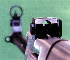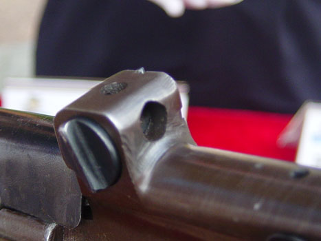 缺口式照门被藏在方形护罩下,压按右侧的表尺调整钮,可旋转调整表尺位置