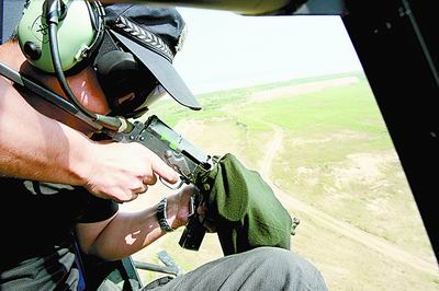在直升机上使用的79式冲锋枪,抛壳口上挂上了弹壳收集袋