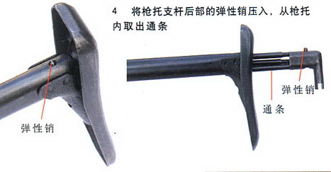 85式微冲的金属枪托不再采用64式微冲向下折叠的双支架结构,而是采用向右折叠的单支撑杆结构。按下枪托卡笋,枪托即可折叠和展开。单支撑杆中空,内部容纳通条。枪托还可以配上贴腮套,在寒带作战时,可保证贴腮的舒适性。