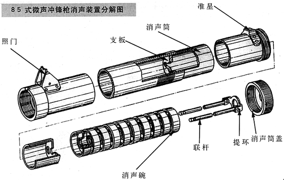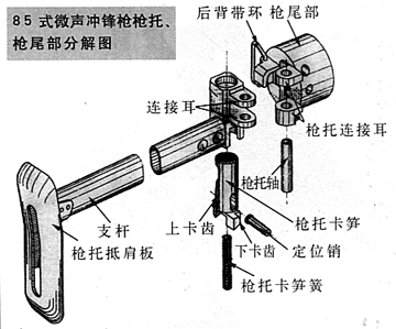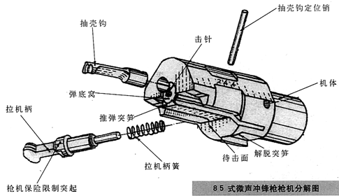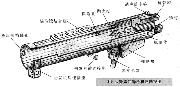 85式微冲由枪管、枪机、消声装置、机匣、枪托等几大部件组成。