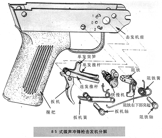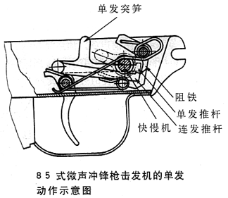 85式微冲采用开膛待击,前冲击发原理。当快慢机柄位于“1”(单发)位置时,快慢机轴上的缺口使单发推杆上抬与阻铁左下部突起对正。此时连发推杆被快慢轴压下,连发推杆前端推不到阻铁右下部突起。扣动扳机后,扳机带动单、连发推杆向前,单发推杆推阻铁回转解脱枪机,枪机前进推弹入膛并击发。如果手未放开扳机,枪机后退时,其解脱突笋压下单发推杆上的单发突笋,使单发推杆与阻铁脱离,阻铁在阻铁簧作用下复位,挂住复进的枪机,成待发状态。若要再次发射,须松开扳机,使单发推杆上抬与阻铁对正,此时再扣扳机,可进行下一个射击循环。