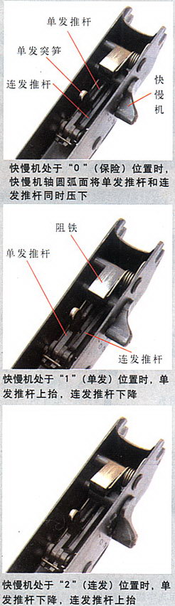 当快慢机柄位于“2”(连发)位置时,连发推杆上抬与阻铁右下部突起对正。此时,单发推杆被压下,其前端推不到阻铁左下部突起;因单发突笋下降,其不再与枪机解脱突笋发生作用。扣压扳机后,扳机带动连发推杆向前,连发推杆推阻铁回转解脱枪机,枪机前进推弹入膛并击发。只要不松开扳机,连发推杆始终推住阻铁,使其无法上抬而挂住枪机,枪机后退到位后又在复进簧的作用下前进,推弹入膛,击发枪弹,直到松开扳机或打空弹匣。