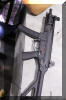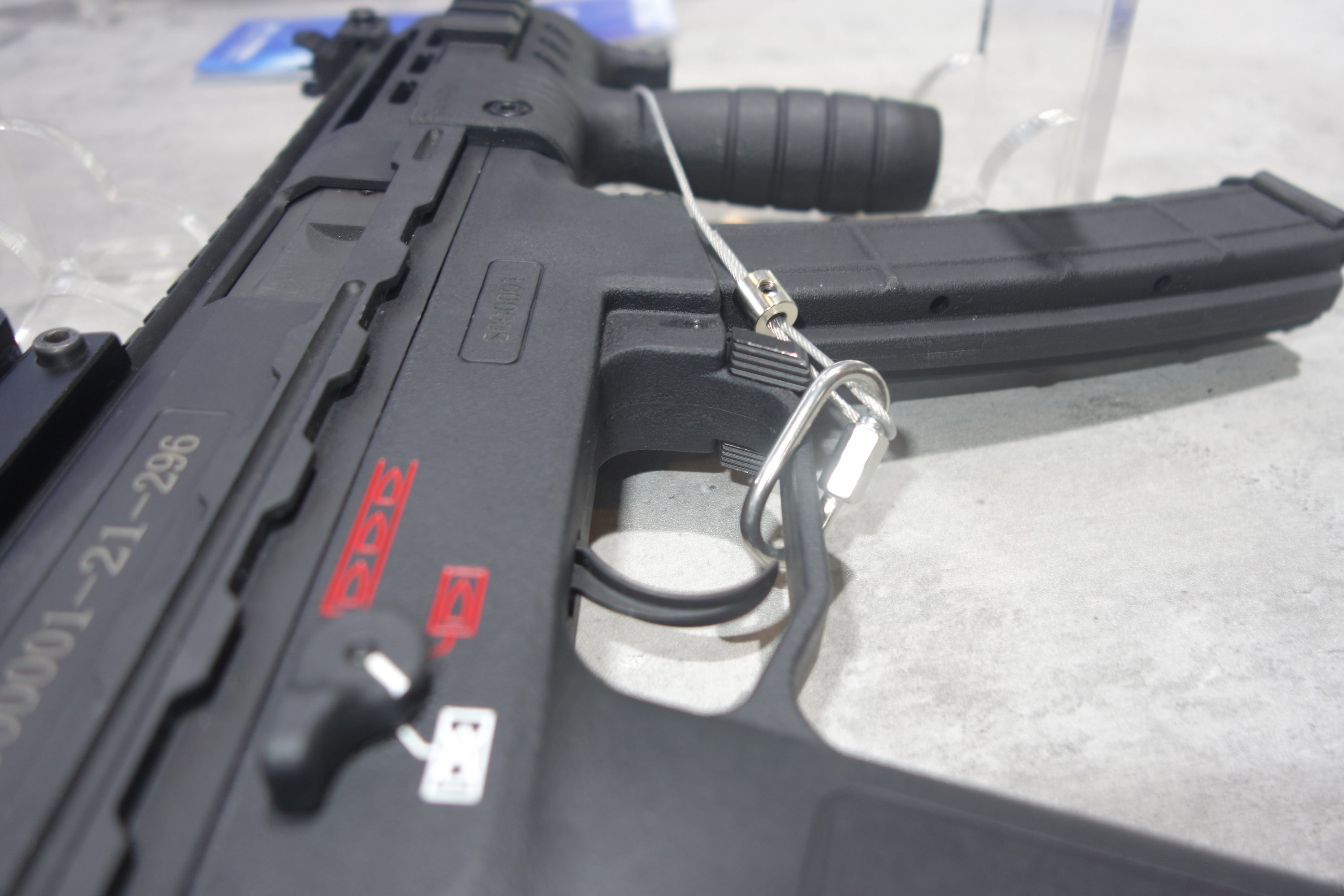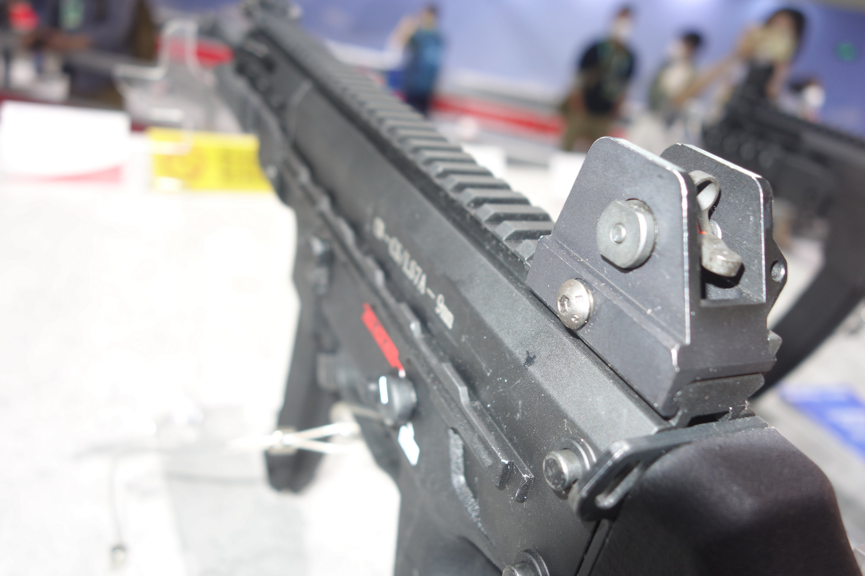 下机匣左侧有空仓挂机释放钮。机械瞄具是固定的,准星有护圈保护。枪托有两种类型,一种是伸缩式,其固定卡扣的设计是类似于MP5的绕轴转动的大拨片;另一种是折叠式的塑料枪托,从图片判断托底板似乎可以伸出。
