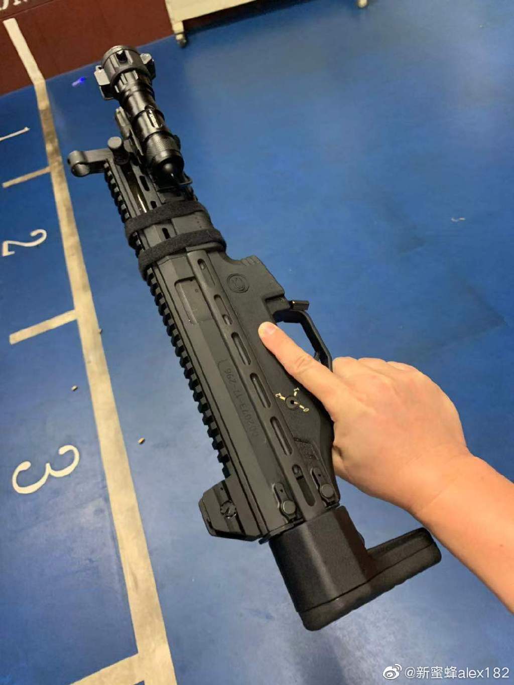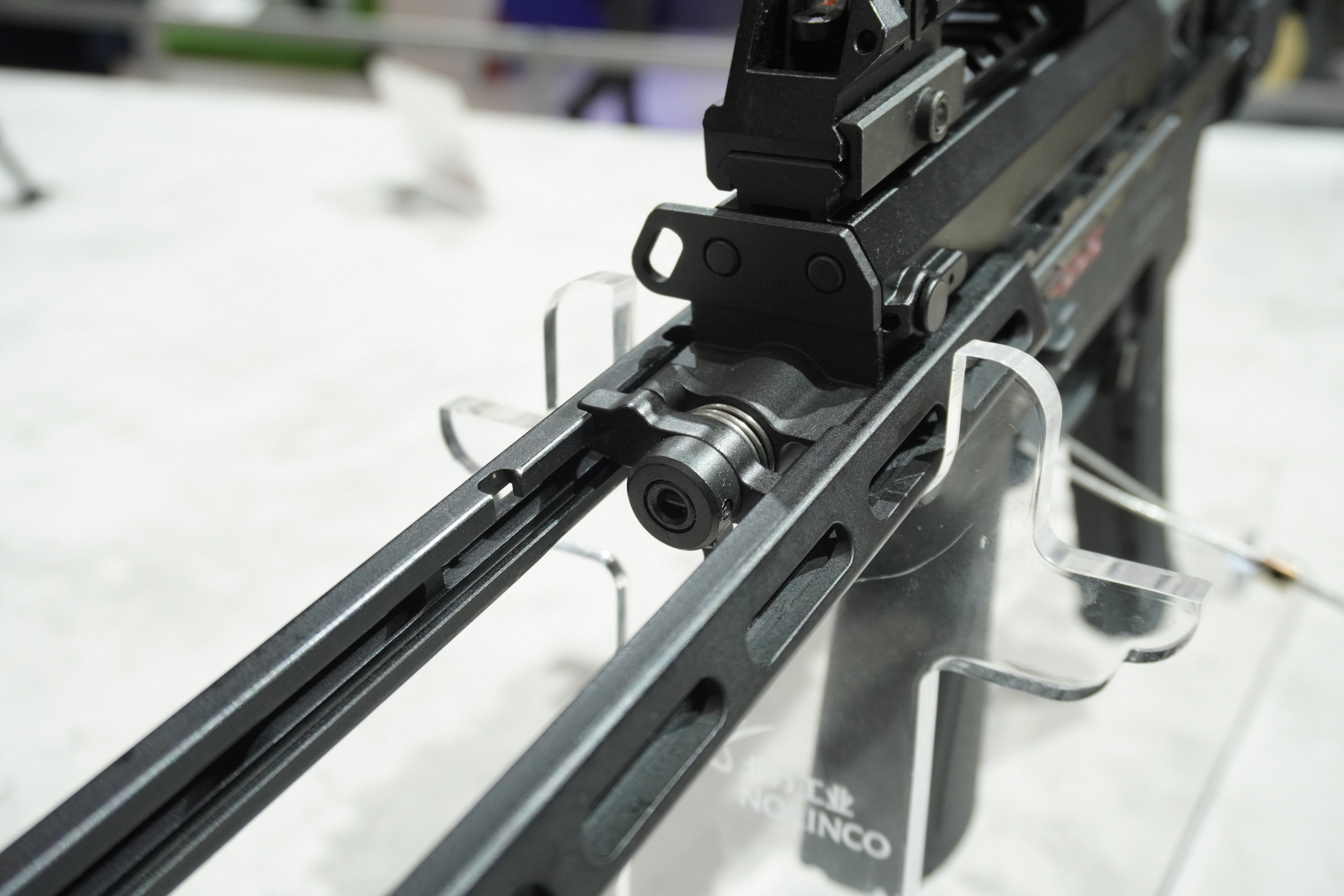 早期曝光的型号中,拉机柄应该可以左右互换,因为在护木上方,两侧位置都有完全相同的拉机柄活动槽。但最近曝光的一种护木上,左侧的拉机柄活动槽被取消。