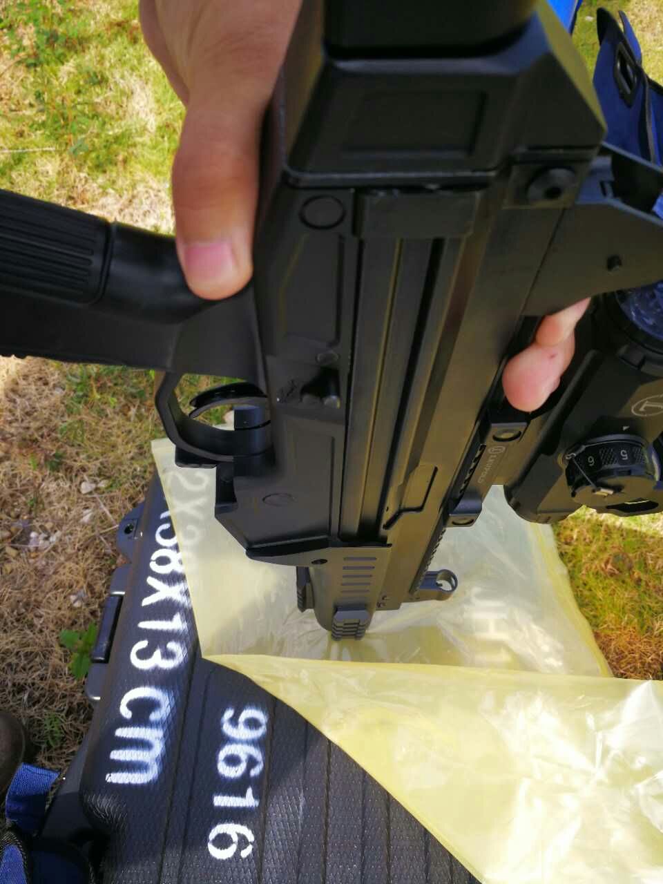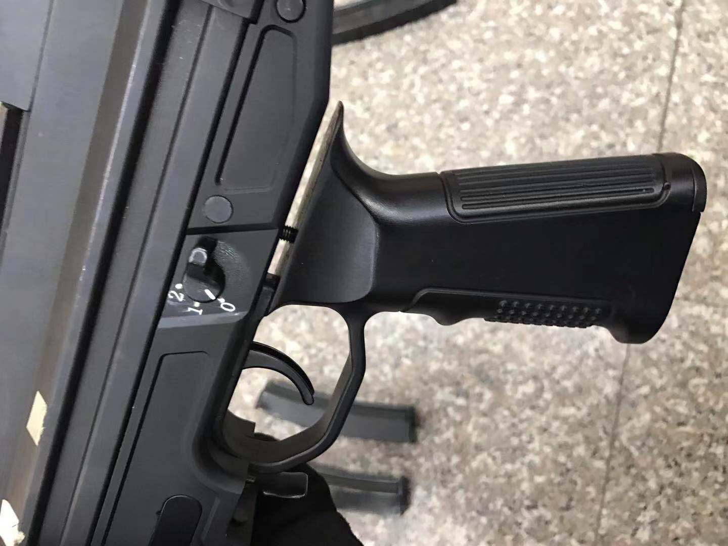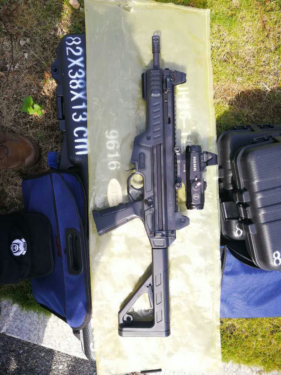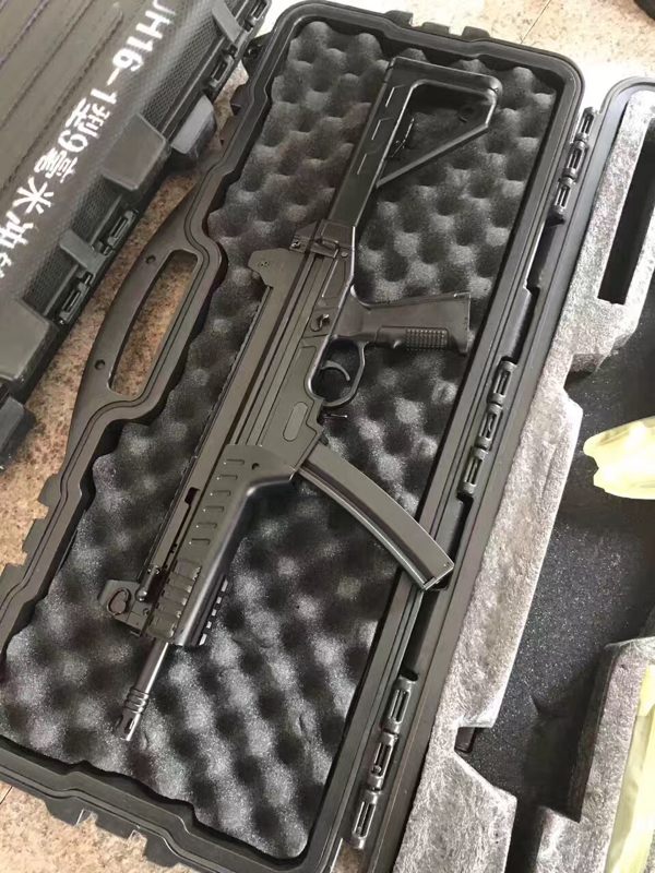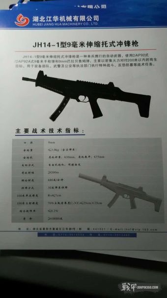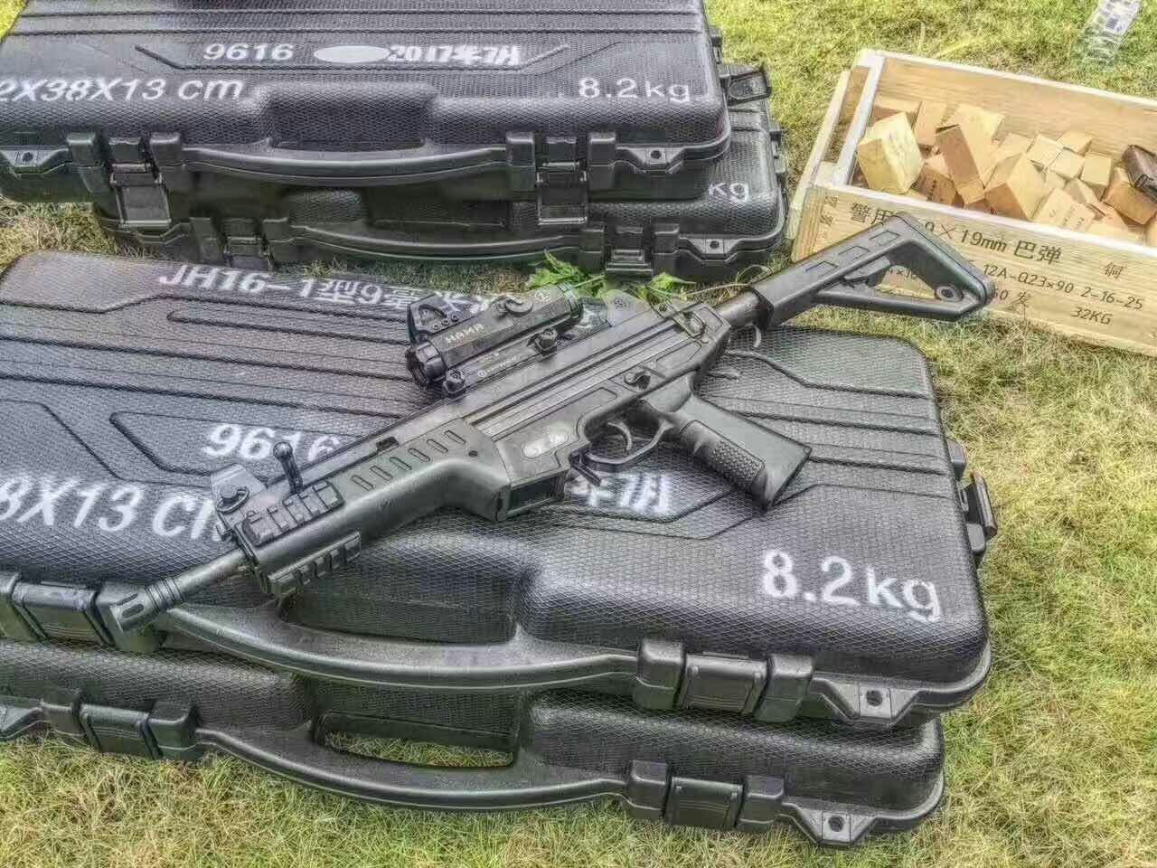 从外观上看,JH16的上机匣是金属制品,机匣顶部有全长式的皮卡汀尼导轨,一直延伸至准星座,机匣前端的下方安装有工程塑料制的护木,护木的3、6、9点位置有整体注塑出来的小段皮卡汀尼导轨,下机匣也是金属制品,塑料制的手枪形握把通过螺柱安装在下机匣上。拉机柄位于护木的左上方,可以像MP5一样利用拉机柄活动槽的卡口手动挂机,与其说JH16像MP5,不如说它更像司登——同样是自由式枪机、可手动挂机,只不过拉机柄的位置不同。JH16的枪托是伸缩式,快慢机在机匣两侧都可操作。