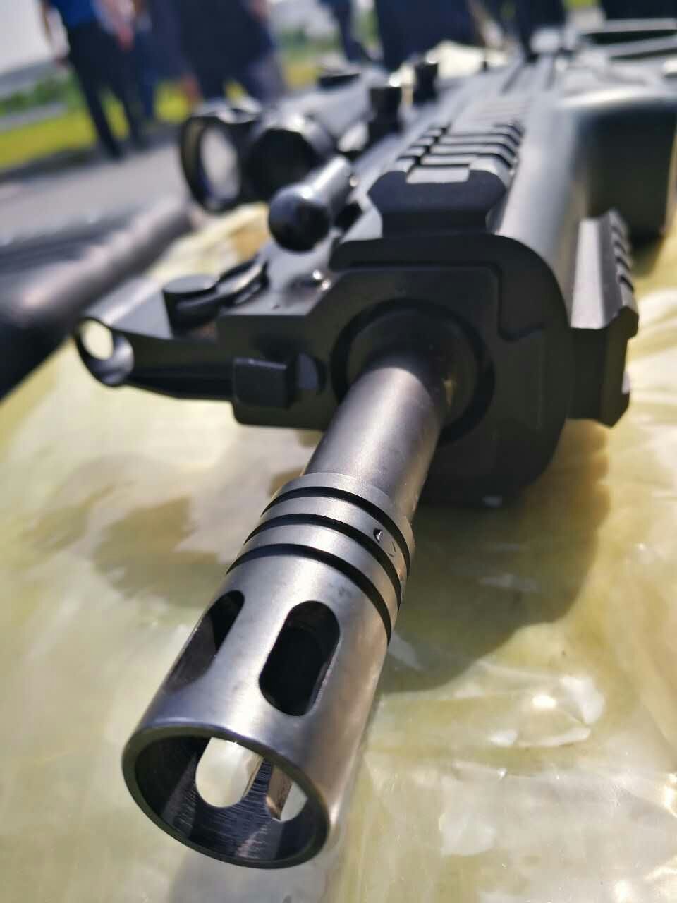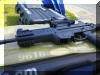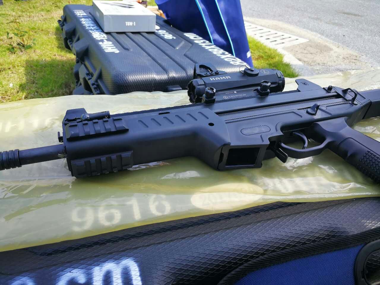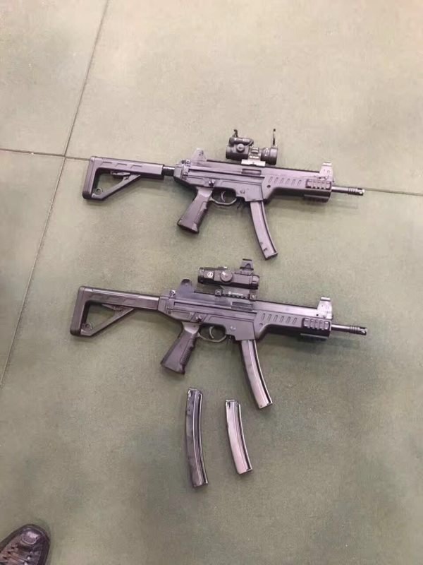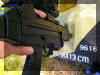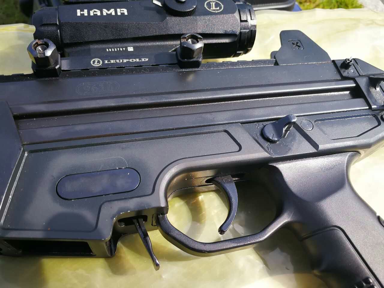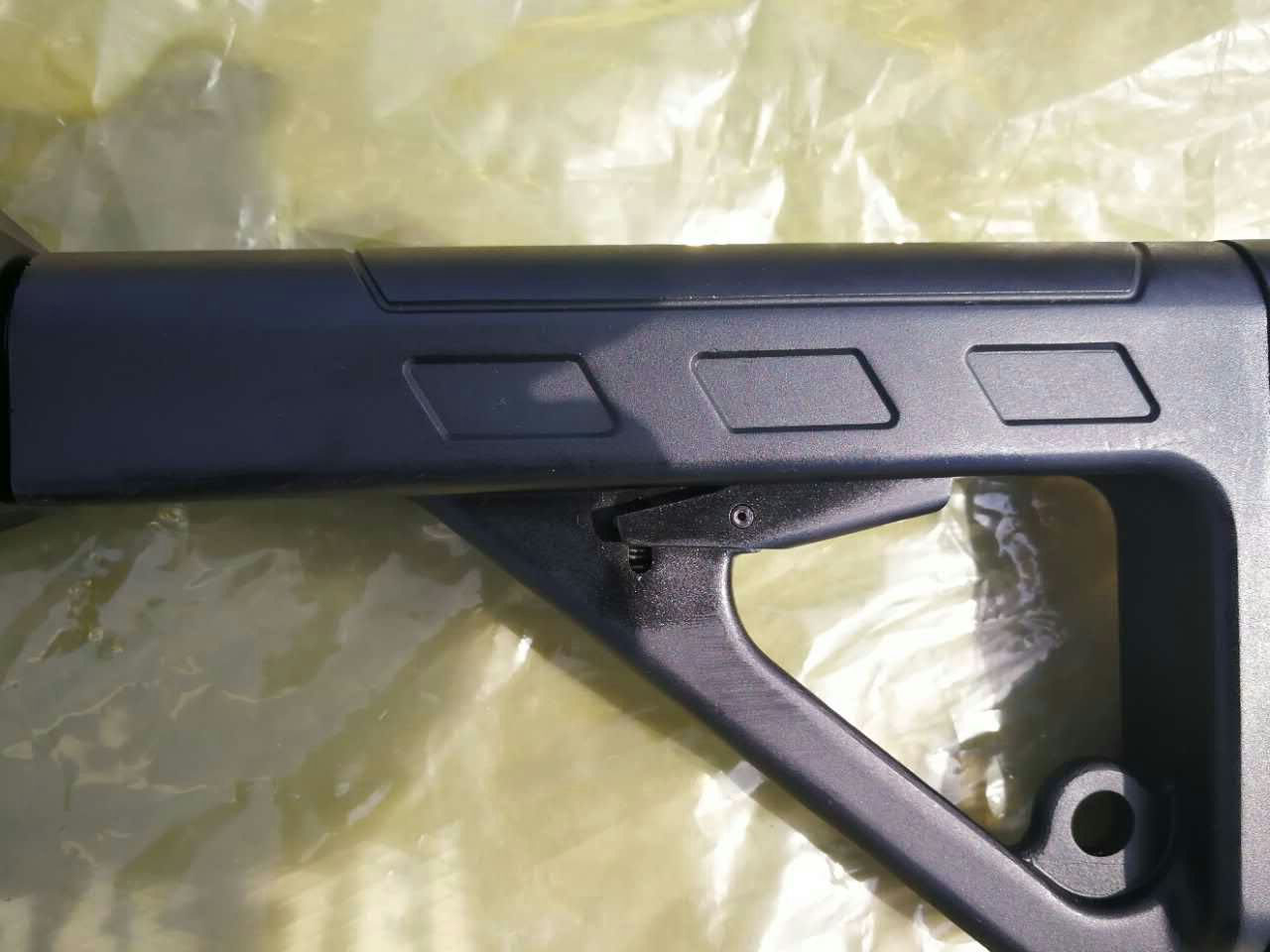 从外观上看,JH16的上机匣是金属制品,机匣顶部有全长式的皮卡汀尼导轨,一直延伸至准星座,机匣前端的下方安装有工程塑料制的护木,护木的3、6、9点位置有整体注塑出来的小段皮卡汀尼导轨,下机匣也是金属制品,塑料制的手枪形握把通过螺柱安装在下机匣上。拉机柄位于护木的左上方,可以像MP5一样利用拉机柄活动槽的卡口手动挂机,与其说JH16像MP5,不如说它更像司登——同样是自由式枪机、可手动挂机,只不过拉机柄的位置不同。JH16的枪托是伸缩式,快慢机在机匣两侧都可操作。