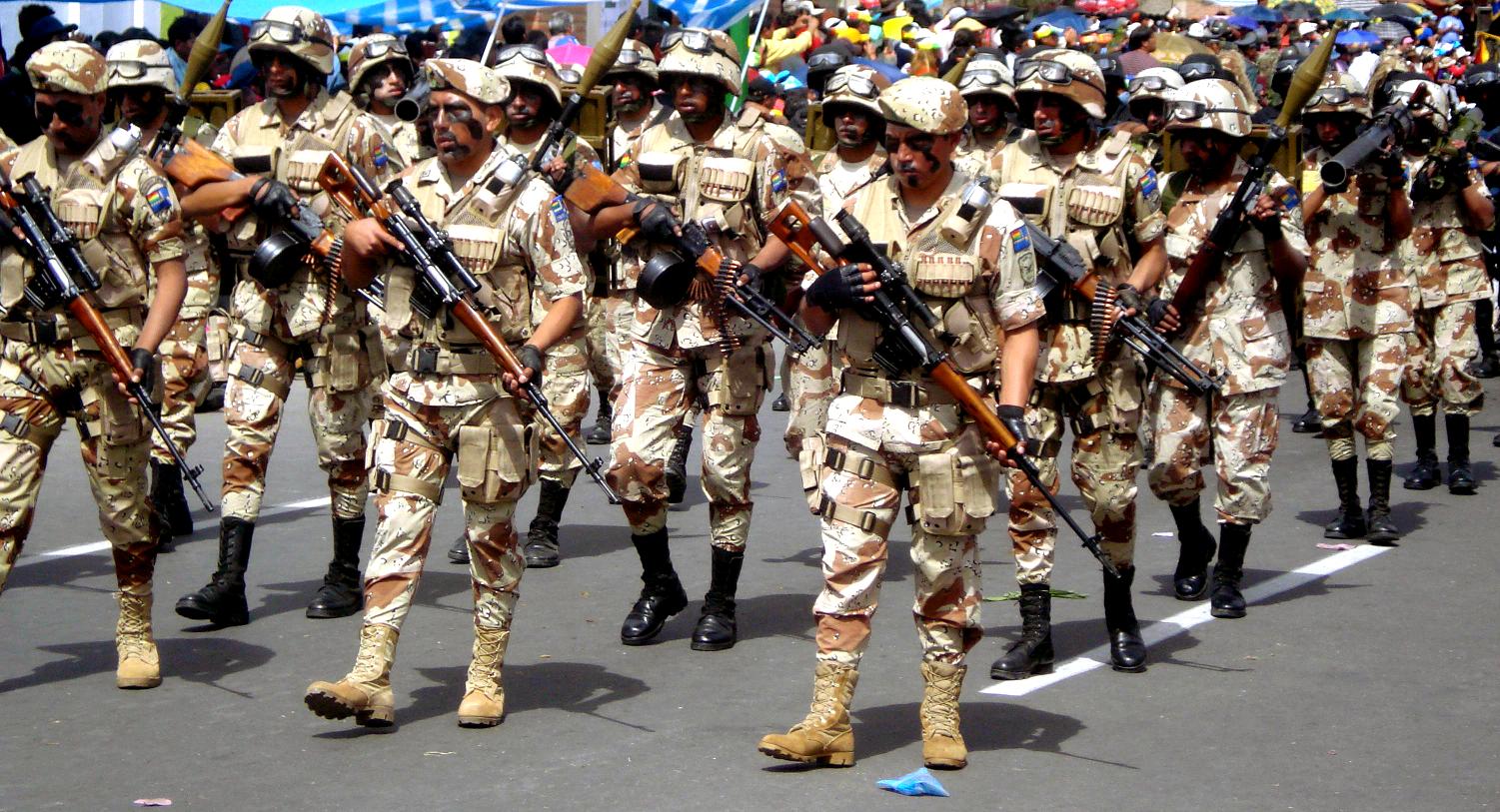 2011年4月玻利维亚阅兵式上的全套中国装备,除了79式狙击步枪外,后面的人还有56式班机,69-1式火箭筒和79式82mm无座力炮