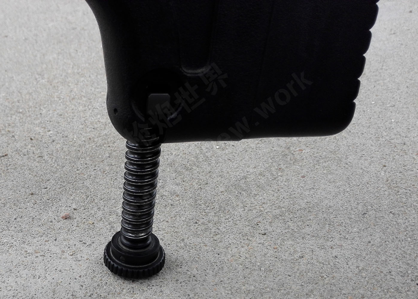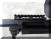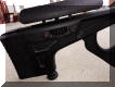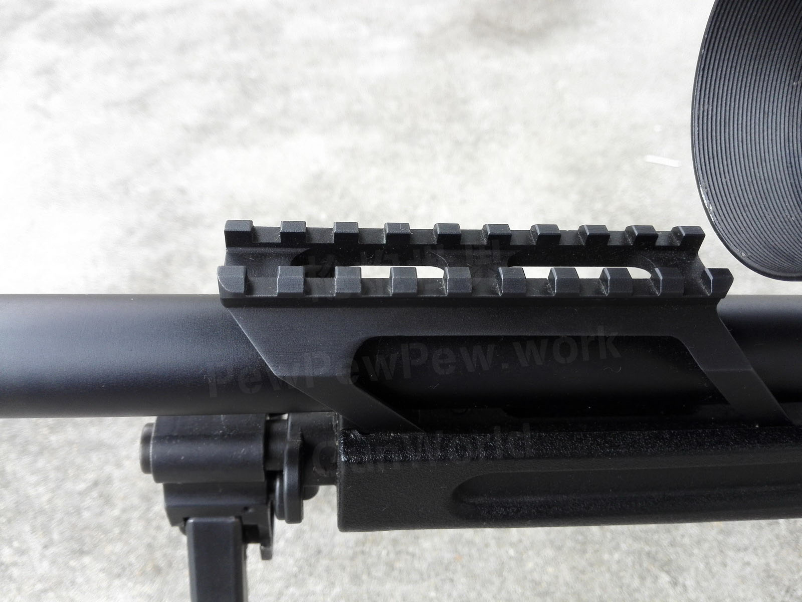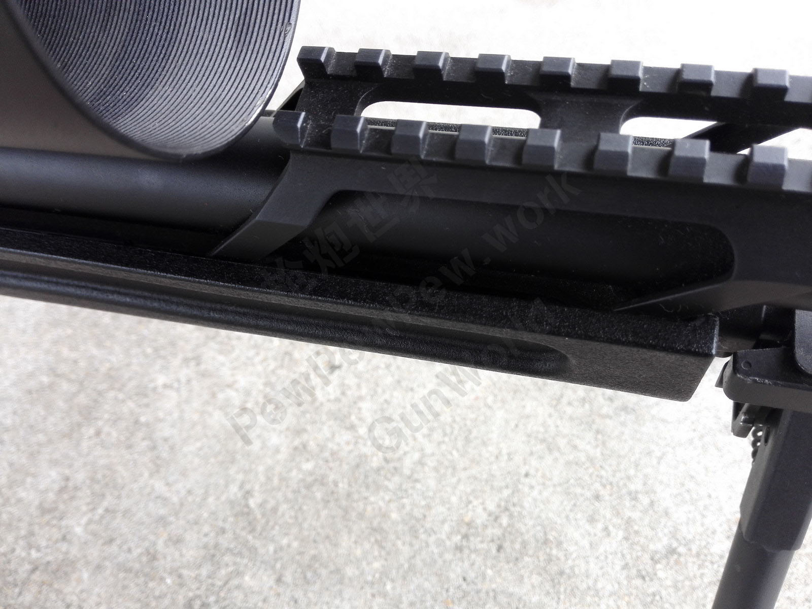 枪托/护手采用纤维增强热塑塑料内嵌钢件注塑成型,全长720mm,通过前后两个螺钉与机匣连接,与枪管不接触。枪托的橡胶托底板可调节高低,并可通过增减垫片数量来调节长度;而贴腮板可调节高低,枪托底部有螺旋调节的伸缩式尾撑。护手底部有脚架连接座,安装长度可调的两脚架。