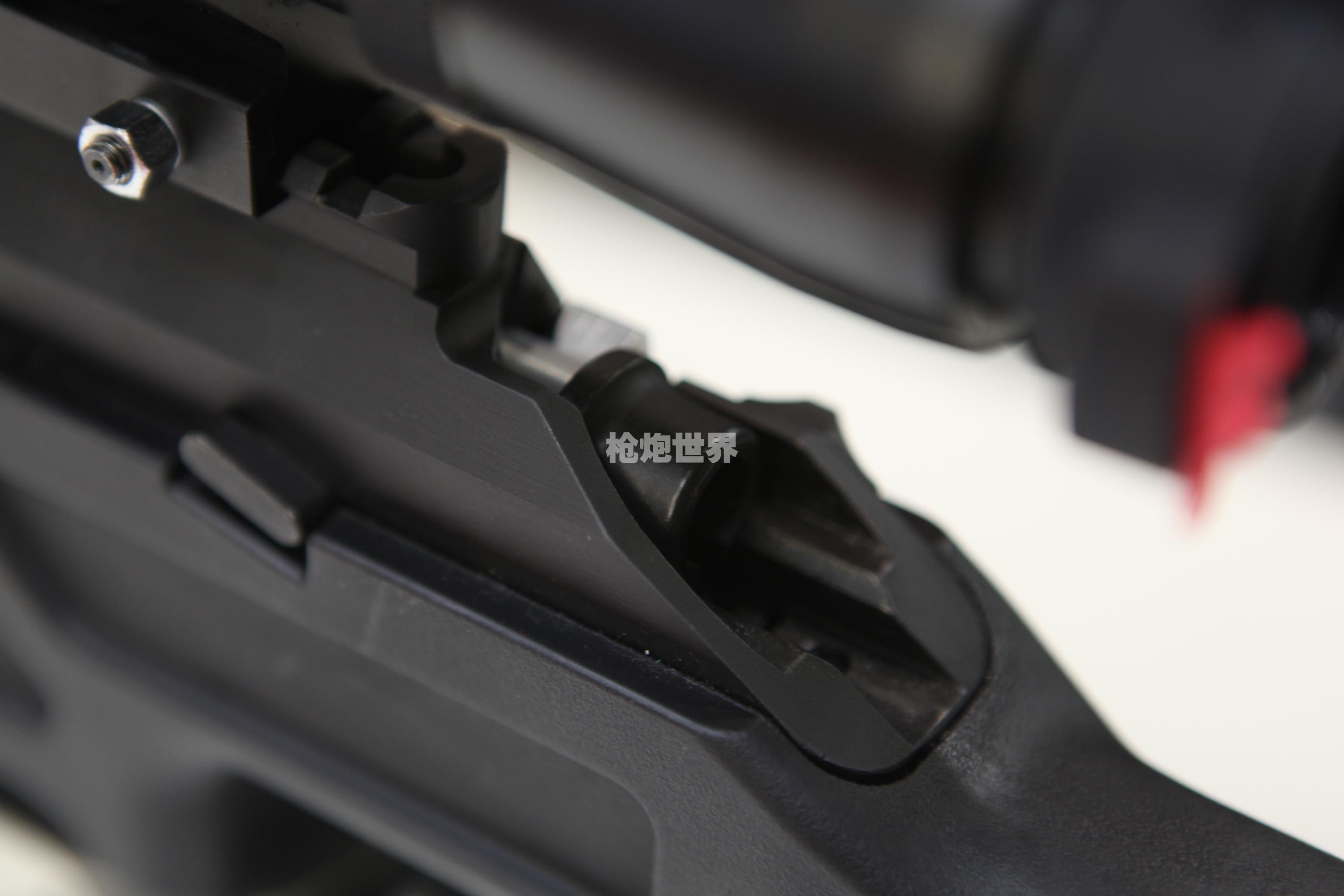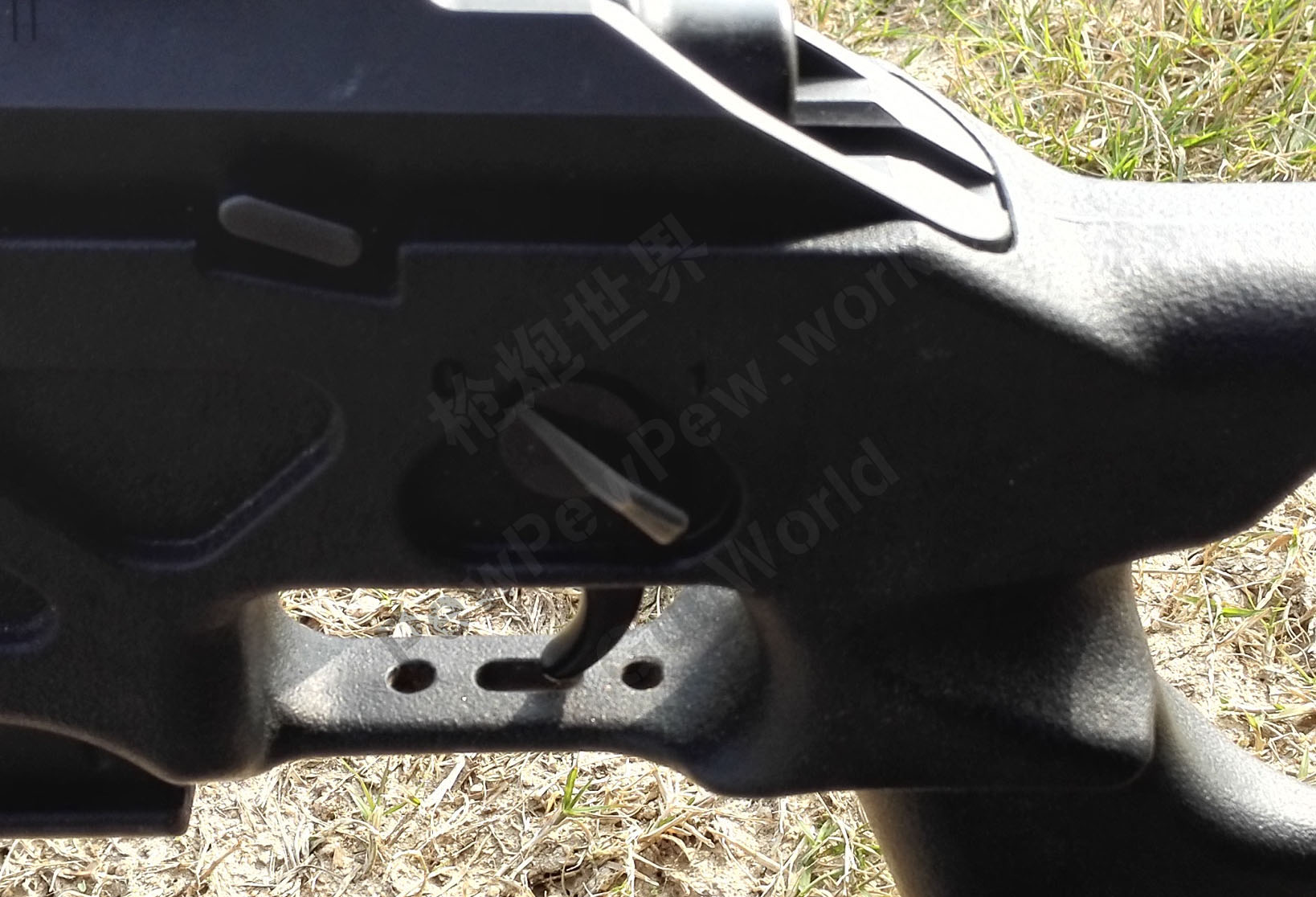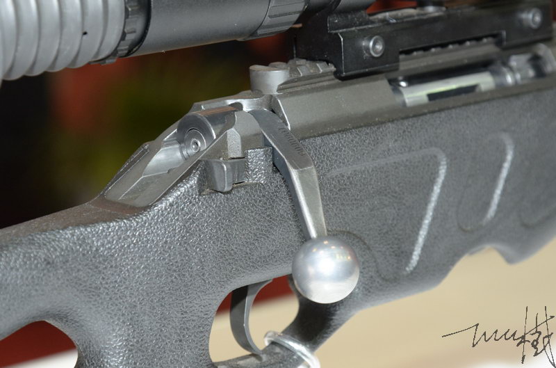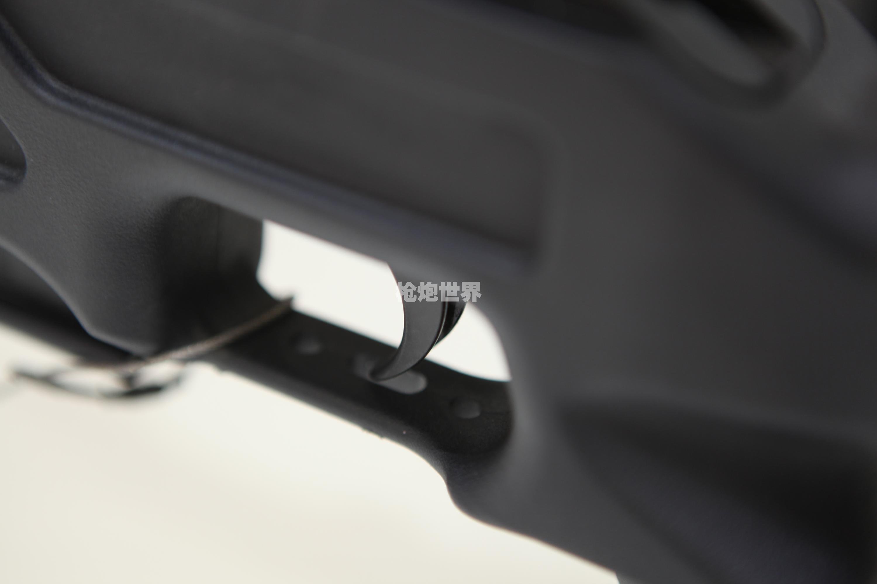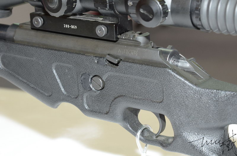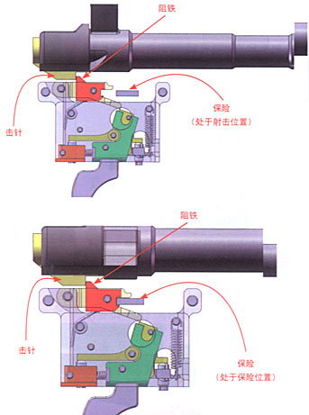扳机为两道火,可通过调节螺钉使扳机力在8N至15N之间调节,而且扳机前后位置也可以调节。手动保险杆在机匣右侧、发射机座上方,保险杆推到后方为保险位置,推到前方为射击位置。枪机头有3个闭锁突笋,抽壳钩和抛壳挺都安装机头体上。