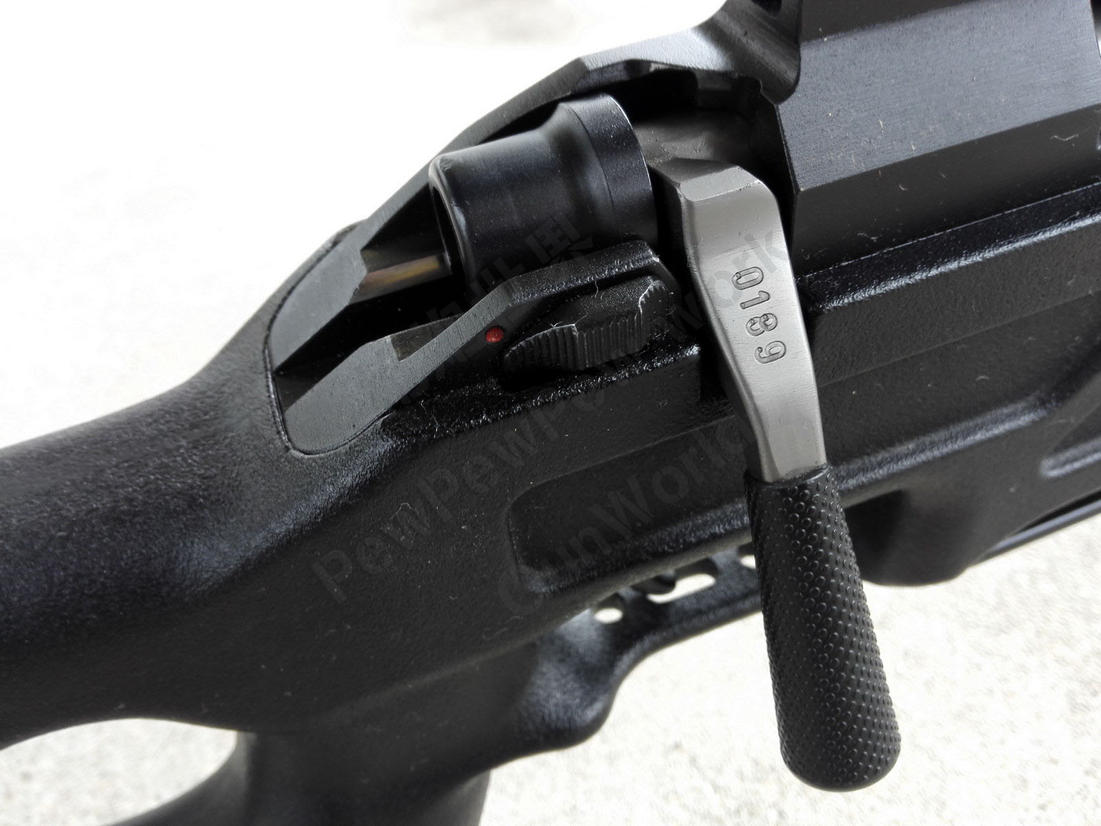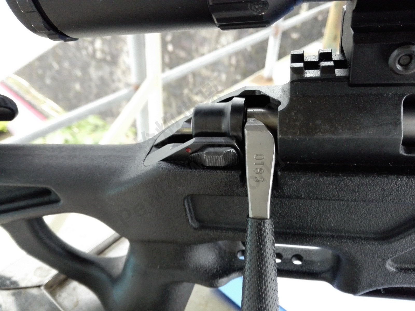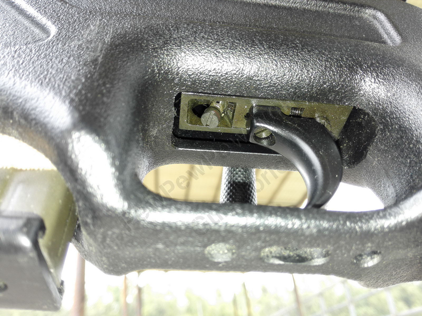扳机为两道火,可通过调节螺钉使扳机力在8N至15N之间调节,而且扳机前后位置也可以调节。手动保险杆在机匣右侧、发射机座上方,保险杆推到后方为保险位置,推到前方为射击位置。枪机头有3个闭锁突笋,抽壳钩和抛壳挺都安装机头体上。