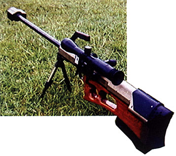 文中提到,该枪的高效制退/消焰器效率也极好,卧姿抵肩射击时,可感后坐力与12号霰弹枪差不多,而测得的枪口焰也比85式高射机枪小。该枪的另一特点是枪管可快速更换,提把与枪管的固定栓二合为一,这样的设计看来是仿效了机枪的特点。除可伸缩的两脚架外,在枪尾底部还有一个辅助支撑杆,并有微调装置,除了便于精确瞄准外,也可以在射击时保护弹匣不与地面接触和碰撞。