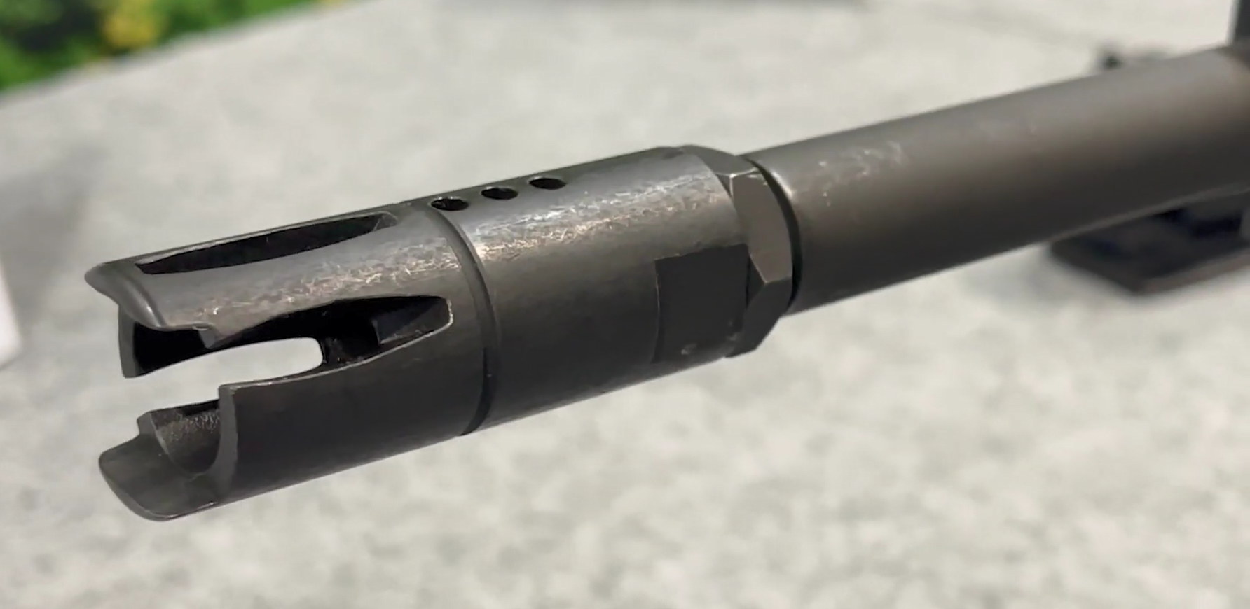 ![]() XT112的枪口消焰器,可以看出T91的消焰器的特征,除了其中两个泄气孔改成开叉 |