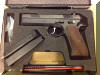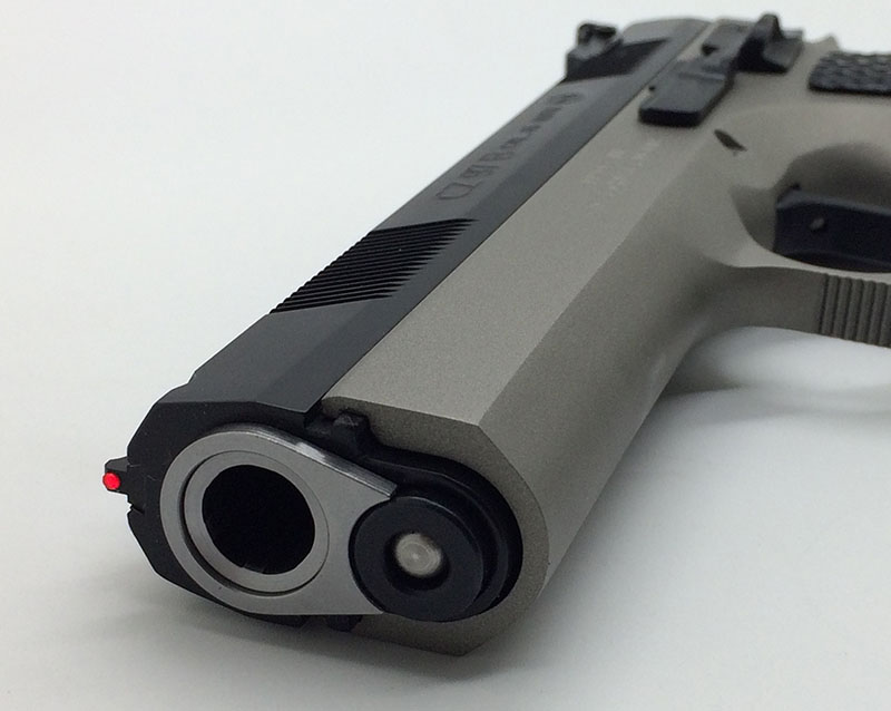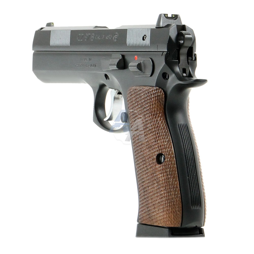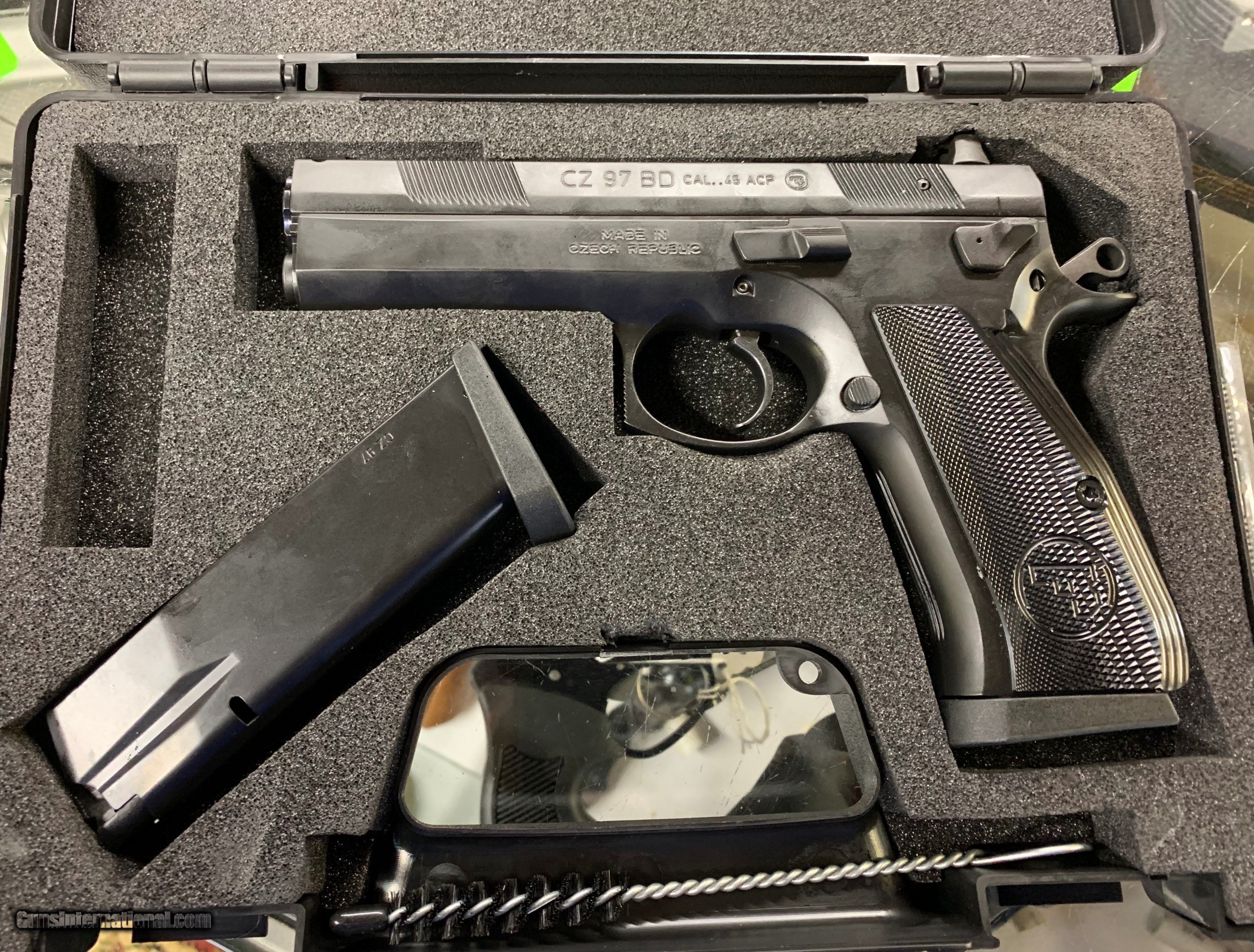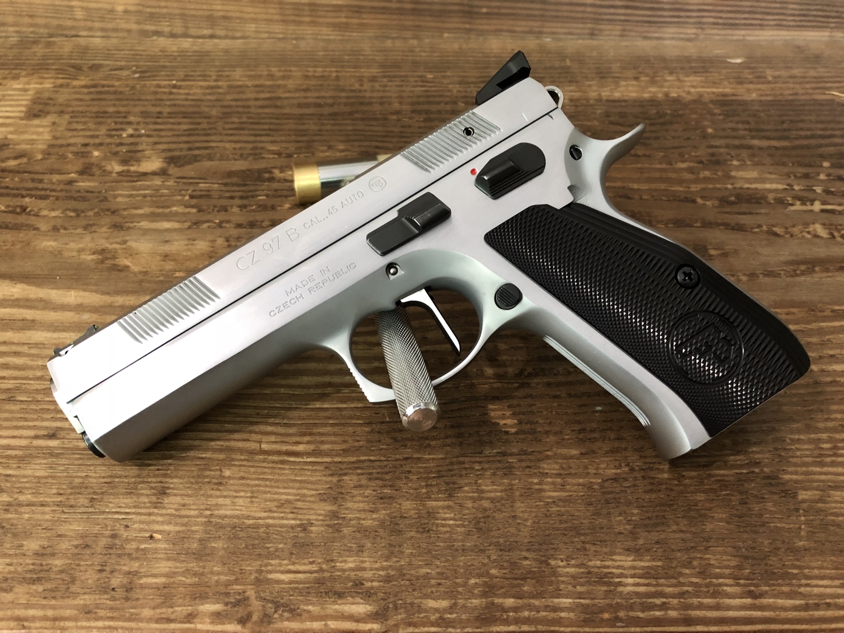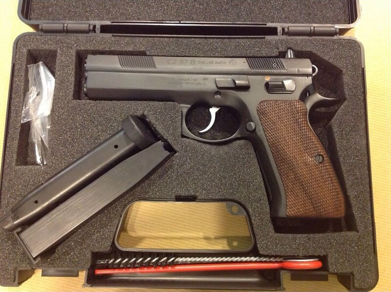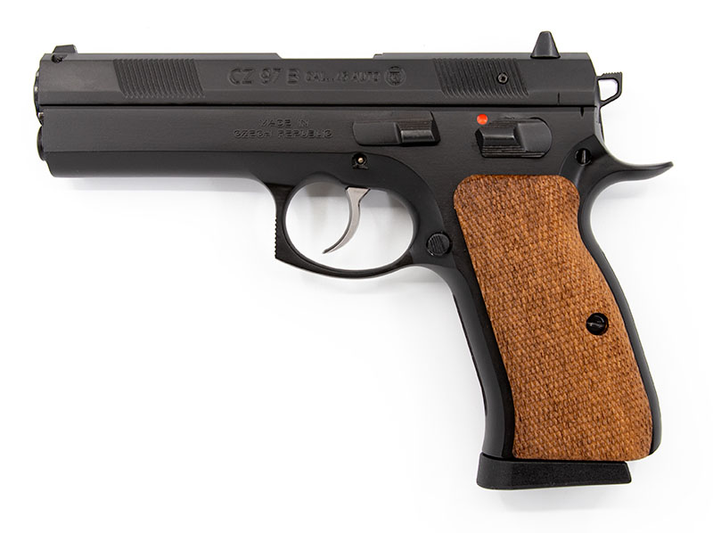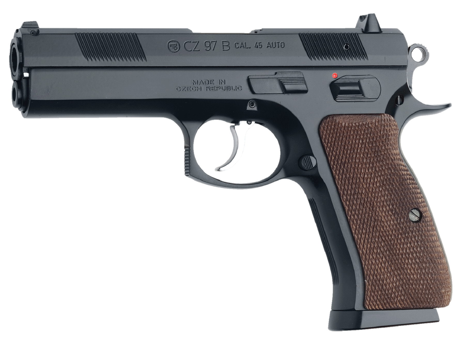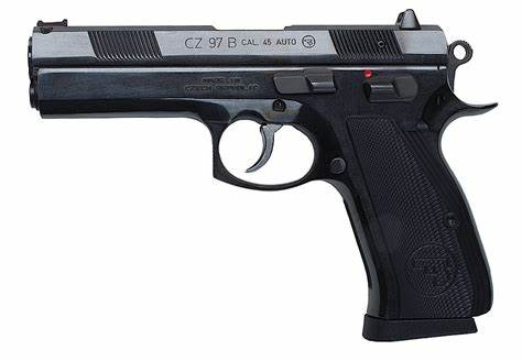 CZ 97B是CZ 75的.45口径型,专门针对美国市场,在1999年代生产和销售。CZ 97B在结构原理上与CZ 75B相同,但放大了套筒与底把,以适应更大的枪弹,另外底把的防尘盖往前延伸至与套筒前端平齐,使套筒不需要增加防尘盖的重量,而且加长的套筒导轨也有利于提高套筒定位的一致性,从而提高射击精度。
