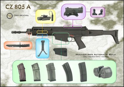 CZ 805采用模块化设计,目前有5.56×45mm和7.62×39mm两种口径,预计将来还要研制6.8mm SPC口径。该枪的上机匣为铝合金,下机匣为聚合物。弹匣插座是一个单独的可拆卸模块,当改变口径时,除了更换枪管外,还需要更换弹匣插座。