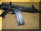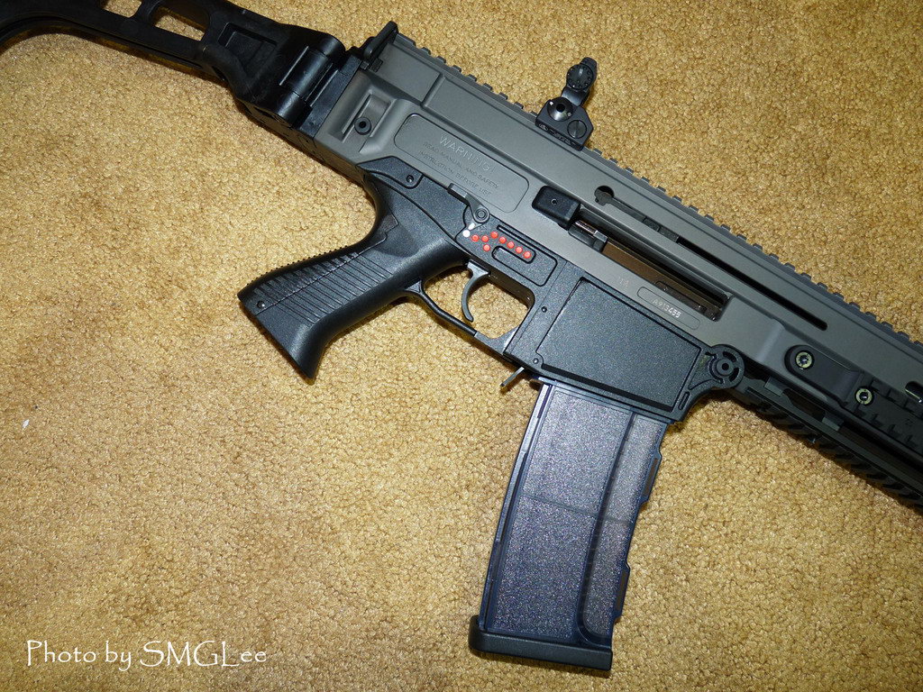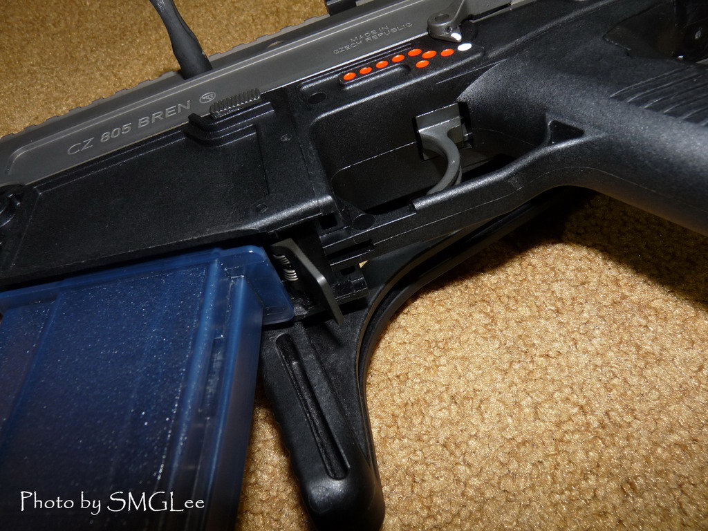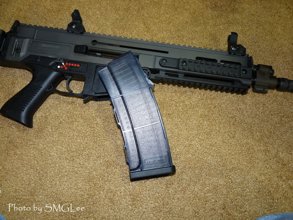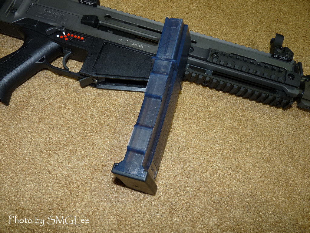 弹匣设计参考G36的设计,为半透明聚合物材料制成,弹匣体上有并联卡销,其中5.56mm弹匣可直接与G36通用。