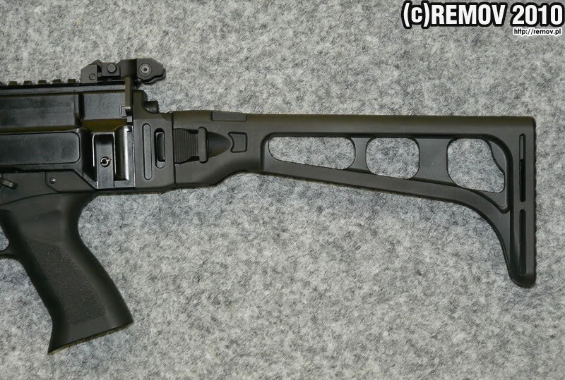枪托可以伸缩和折叠,最初的枪托设计是参考了FN SCAR,虽然细节上有所不同。在2010年推出的改进型枪托,增加了贴腮板,最新的枪托外形又参考了M4的伸缩式枪托。