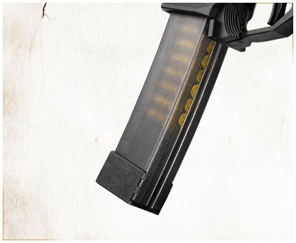弹匣为聚合物制的双排双进弹匣,有20发或30发两种容量。聚合物弹匣体是半透明材料,便于射手观察余弹量。当最后一发弹打完后,会挂起枪机。更换弹匣后,射手只要按下弹匣插座左上方的挂机解脱按钮就能释放枪机。