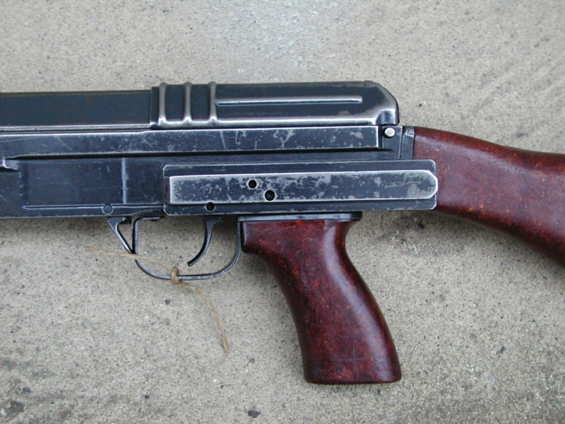 板机组的整体设计相对地简单,而且只有很少的活动部件。由(击发)阻铁、单发杆、连发杆(连发阻铁)、扳机、快慢机、组合片簧及定位片簧组成,并通过扳机轴、阻铁轴和快慢机轴连接在机匣上,再由定位片簧限制各个轴不能脱出。单发杆和连发杆系并排置放,但单发杆靠前1.6mm,连发杆则与不到位保险阻铁相连,只有在机框闭锁确实后,保险阻铁才能顶起连发杆。