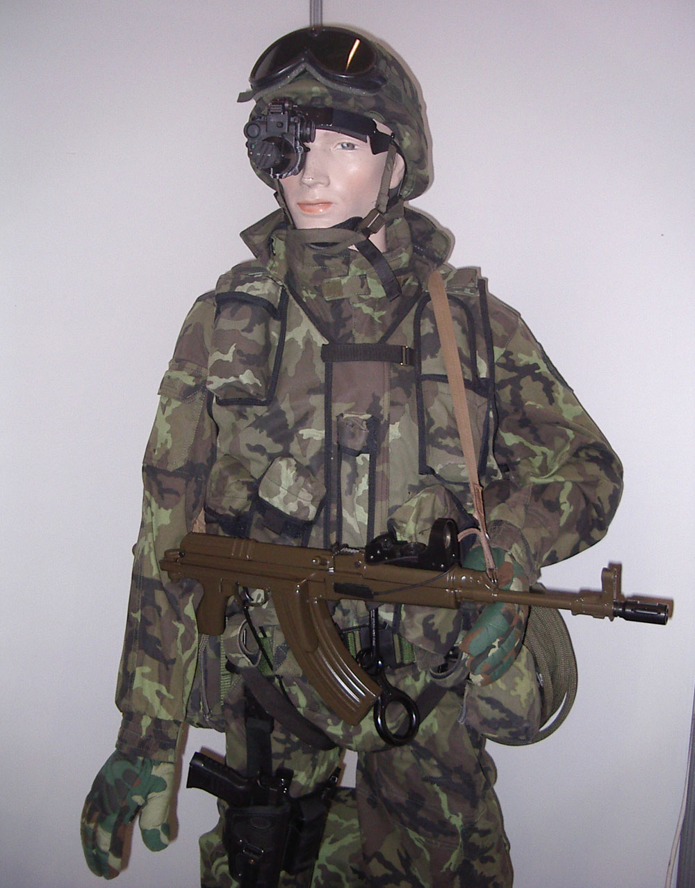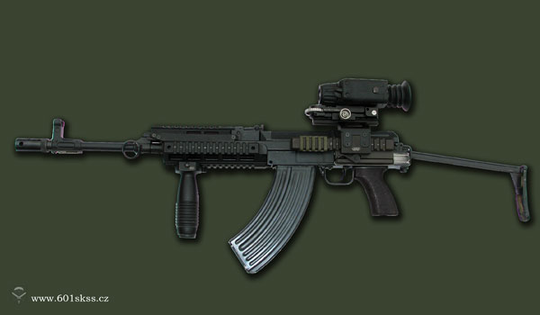 夜战型,在SA Vz.58P步枪的机匣左侧加装一个带燕尾槽的长瞄准镜座,用于安装红外夜视瞄准镜,配有两脚架,枪口上安装有锥形高效消焰器,避免在夜间射击时的枪口焰干扰夜视瞄准镜。 |