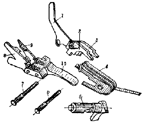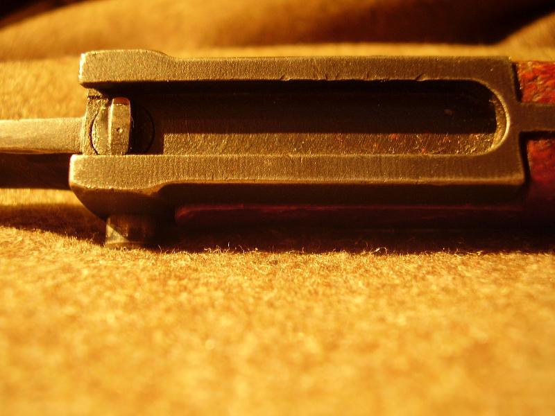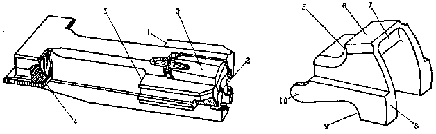 Vz58的枪机和闭锁卡铁:1一闭锁支承面,2一拉壳钩,3一击针,4-回转轴孔,5一闭锁斜面,6一限制面,7一开锁斜面,8一前闭锁支承面,9一后闭锁支承面,10一回转轴耳