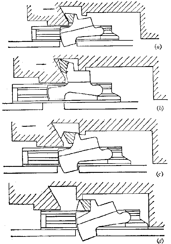 开、闭锁动作示意图:(a)开锁过程;(b)开锁状态;(c)闭锁过程;(d)闭锁状态