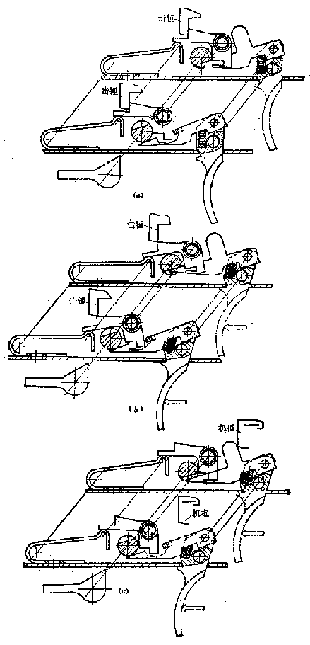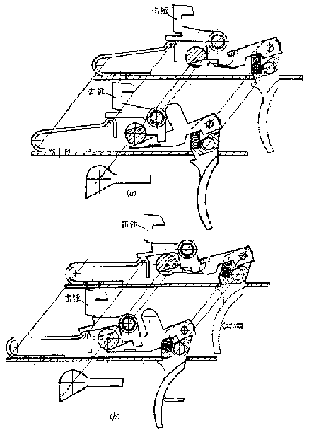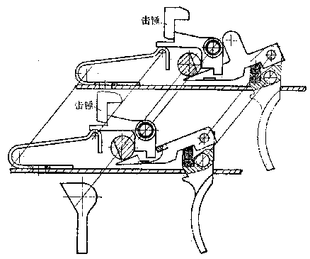 发射机构零部件图:1-不到位保险阻铁传动杆;2-阻铁;3-不到位保险阻铁;4-组合片簧;5-快慢机;6-阻铁轴;7-扳机轴;8-单发杆;9-连发杆;10-扳机