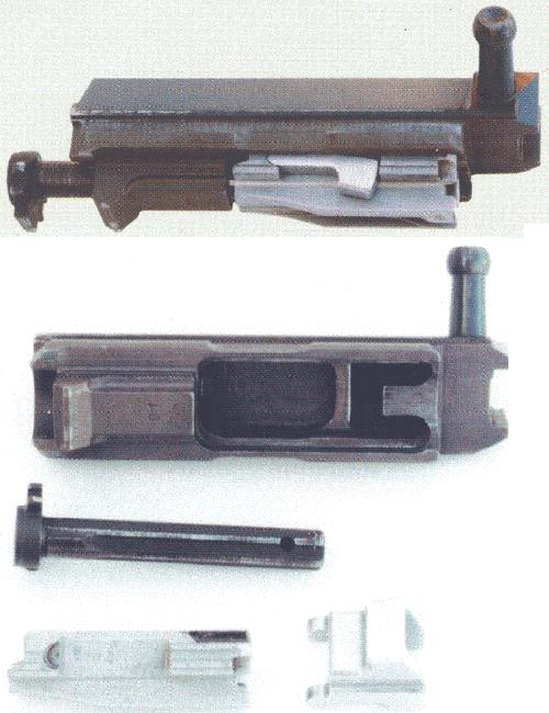 该枪采用摆动式闭锁卡铁系统类似于德国沃尔特P38半自动手枪的闭锁机构。枪机组件由枪机、闭锁卡铁、击针、拉壳钩、拉壳钩簧和顶销组成,闭锁卡铁铰接在枪机下方,枪机前端除有弹,底窝、推弹凸笋、拉壳钩巢和两个对称的闭锁凸笋外,在右侧凸笋前方有空仓挂机卡槽,下面的沟槽用以通过抛壳挺。另外,两侧有对称的回转轴孔,以安装闭锁卡铁的回转轴耳。两侧的导轨导引枪机在机框导槽中运动。击针孔后部是击锤伸入孔,便于击锤打击击针。拉机柄安装在机框的右侧。