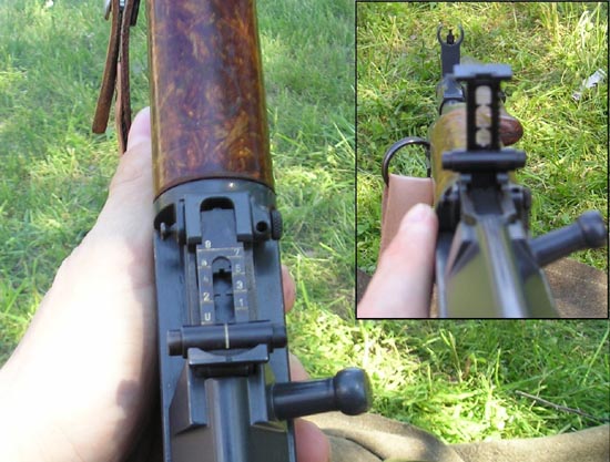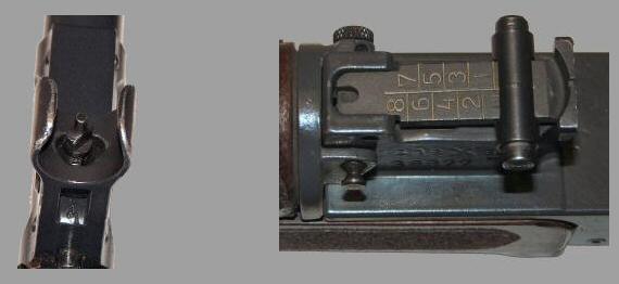 瞄准具是开放式,瞄准基线长356mm。准星为柱形,有护罩;照门为V形缺口式,表尺分划为100~800m,每分划为100m,无风偏修正功能。归零校正时可上下转动或水平移动准星进行。