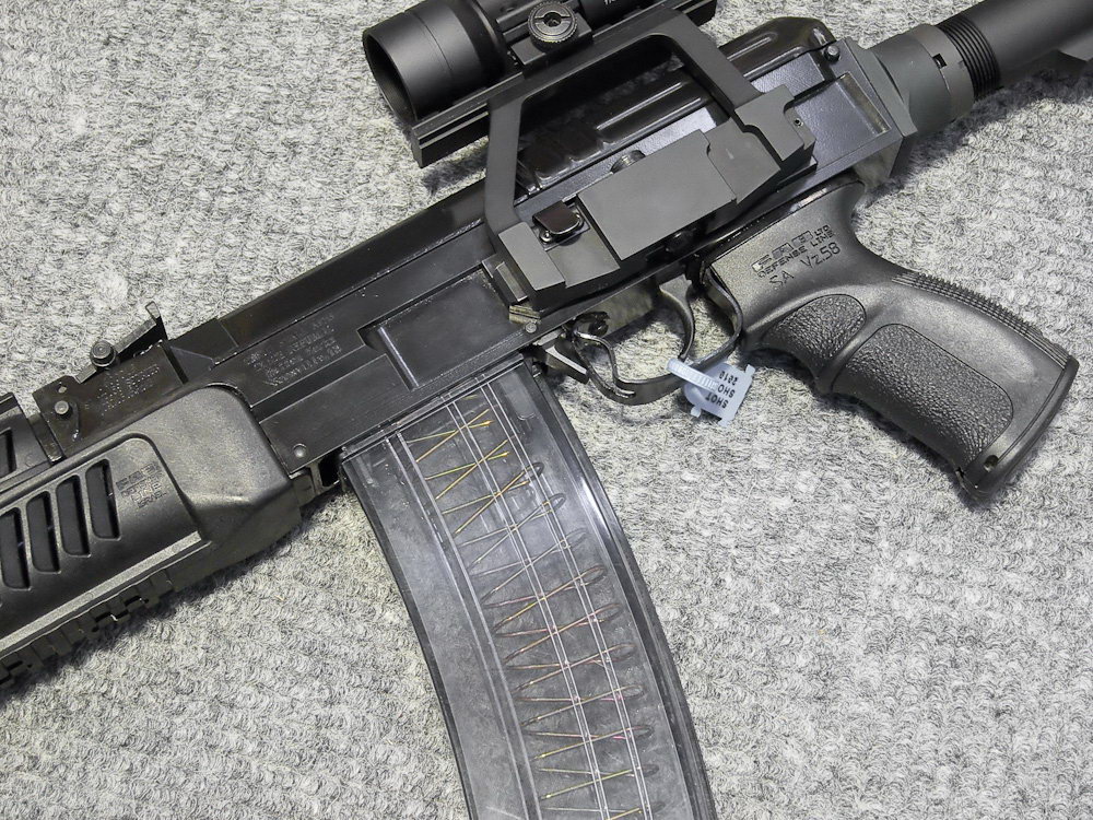 由于枪机组的两个运动导轨的间距较大,因此增大了机框带动枪机的力矩,使机框的能量损耗加大,影响机构动作可靠性。机框带动枪机是通过中间件闭锁卡铁来实现的,在复进时产生楔紧现象,加大摩擦阻力也影响了机构动作的可靠性,此外在推弹过程中当枪弹脱离抱弹口后易被卡在枪机导轨的下侧,增加了推弹阻力,这又是一个影响机构动作可靠性的原因。我国在1980年代曾对众多外国轻武器进行过广泛的对比试验,在对Vz58突击步枪进行浸河水试验时,每发都出现复进不到位的故障。