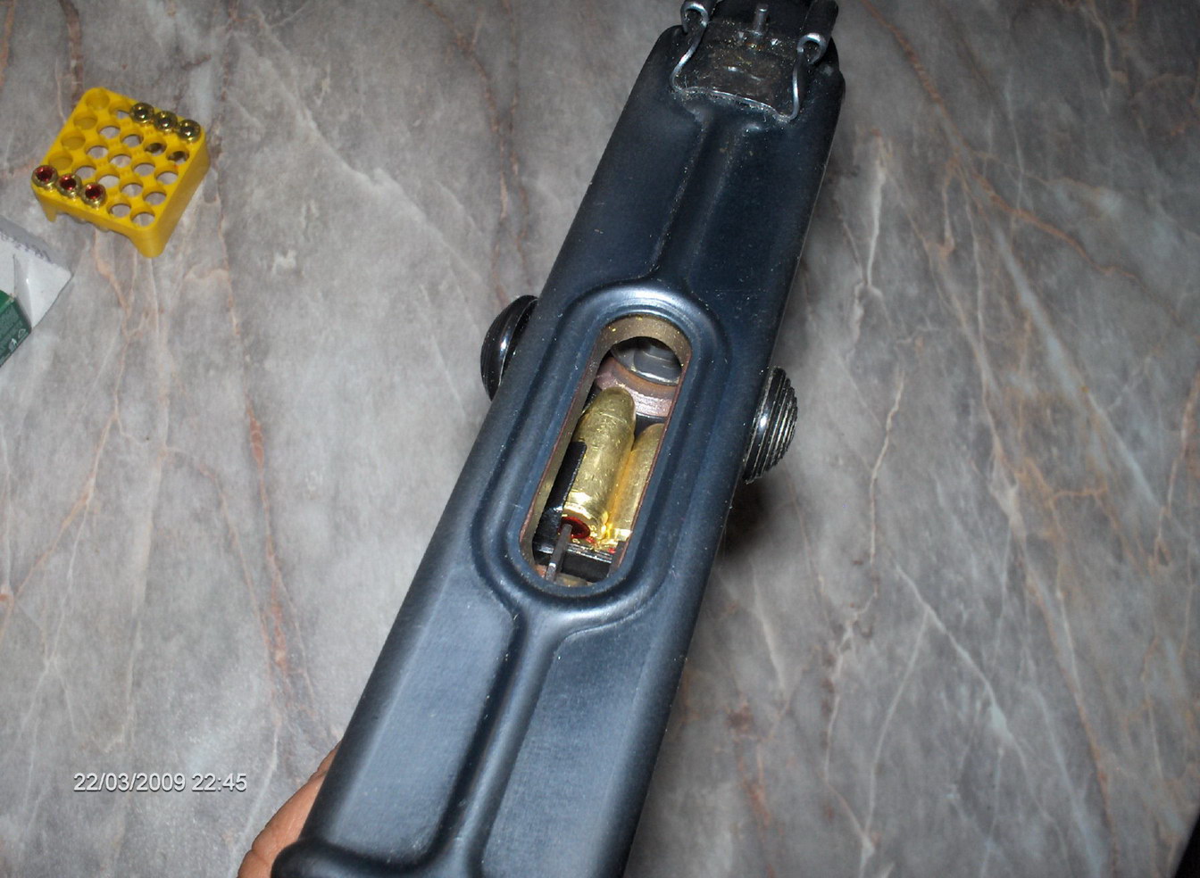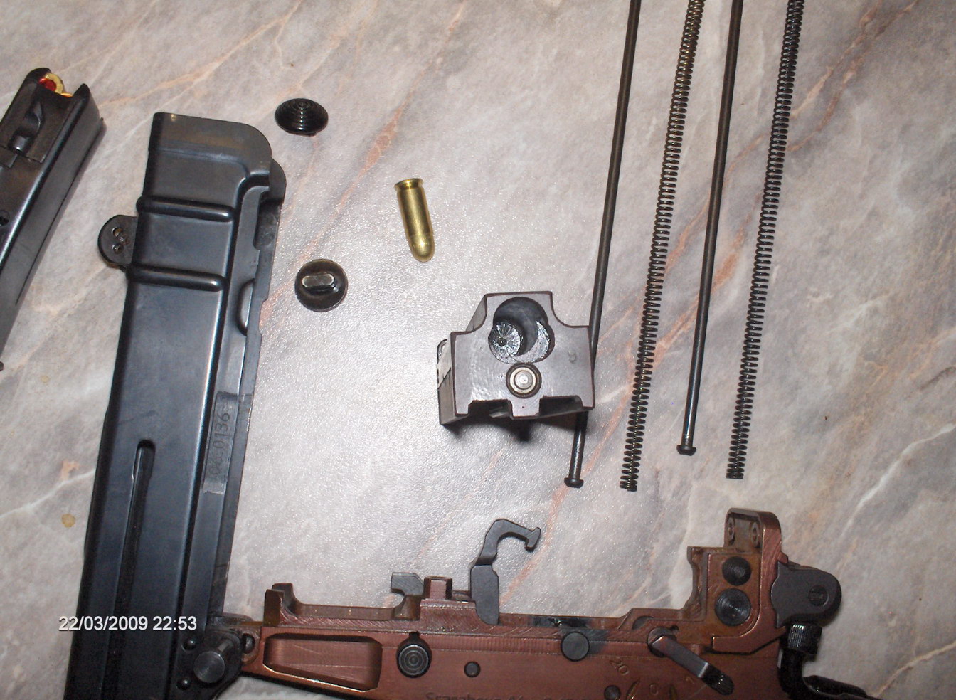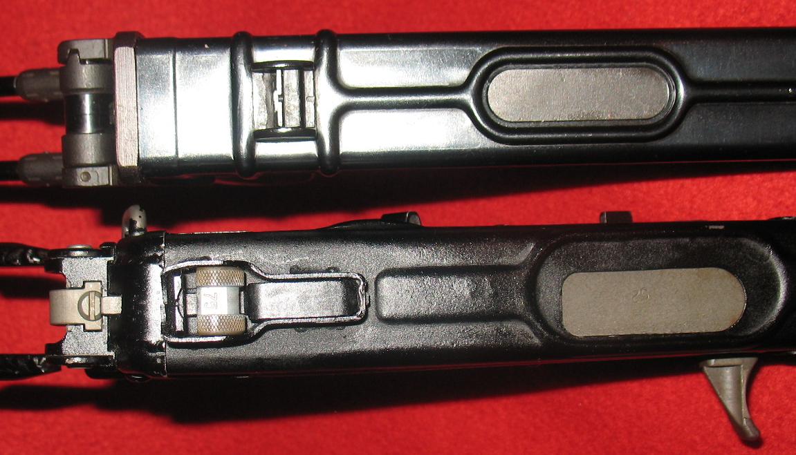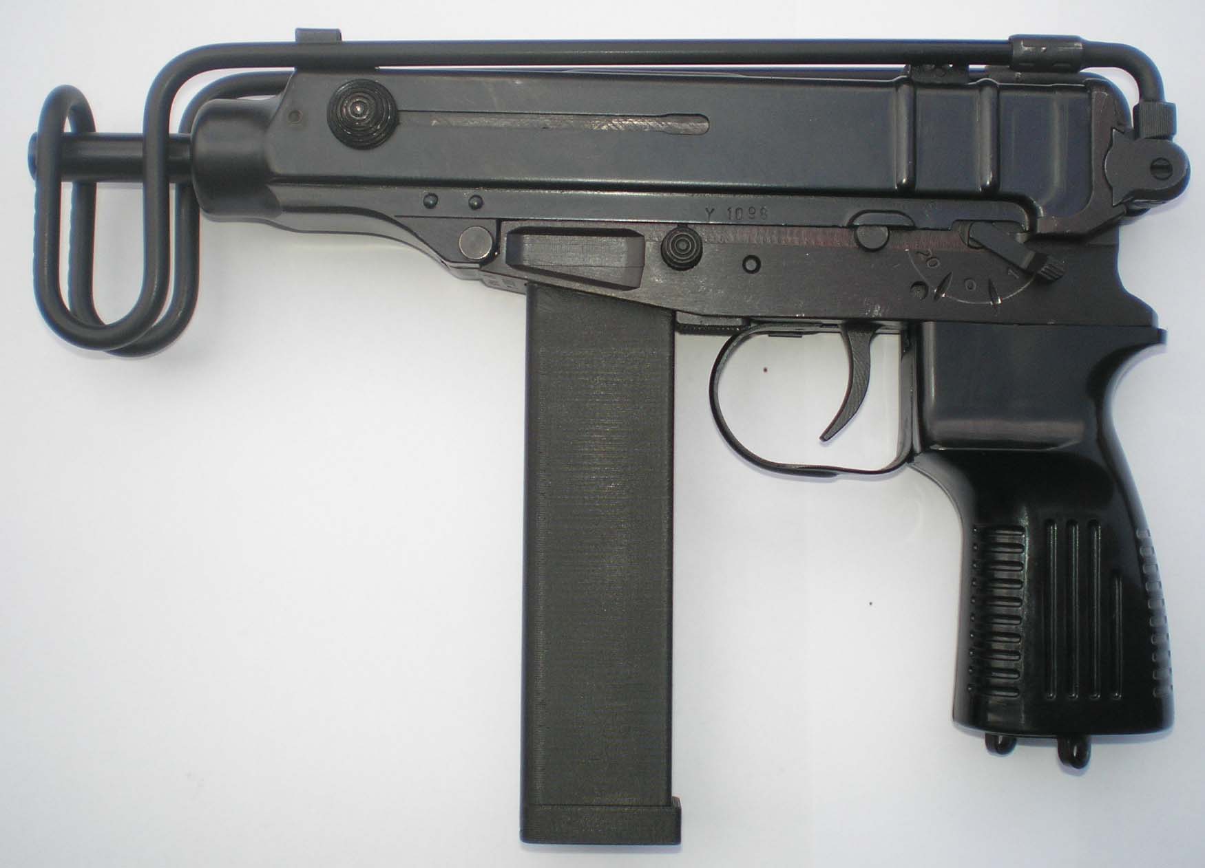弹匣为双排,容量有10和20发两种,折叠枪托式用钢线制成。随枪通常配发一个手枪式的枪套和弹匣袋。