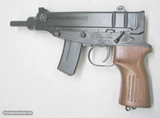 “蝎”式冲锋枪在1950年后期开始的研制,由Miroslav Rybá(1924-1970)设计,其目的是为非一线战斗步兵单位提供一种重量轻的但比手枪更有效的个人防卫武器。该枪的第一个原型在1959年制造,当时称为S-59冲锋枪。在1961年正式获得采用时,被定型为“Samopal Vzor 1961”,这句捷克语翻译成中文是“1961型冲锋枪”,或简称SA Vz.61,其口径为7.65×17mm勃朗宁手枪短弹。这件武器被配发到捷克斯洛伐克军队中的各种不同单位,以及广泛地出口。该枪定型后很快就取代了捷克斯洛伐克军队原装备M52 7.62mm手枪,主要装备伞兵、特种部队、装甲车/直升机组成员和军官,捷克的警察也大量装备。由于7.65mm勃朗宁短弹(在美国称为.32 ACP弹)在西方也很流行,因此该枪也大量出口到国外,一些非洲国家的军队或警察也装备该枪。从1962年至1979年间大约生产了210,000支(之后的产量不详)。据说有一些民航客机上的防劫机保安人员也选用该枪,因为.32 ACP弹无法穿透机舱蒙皮。