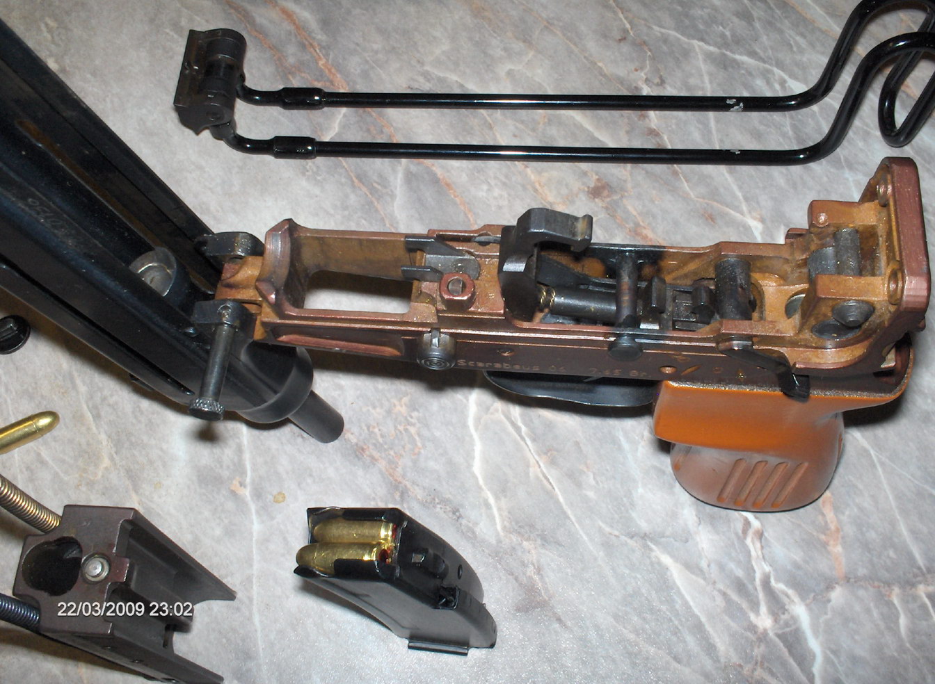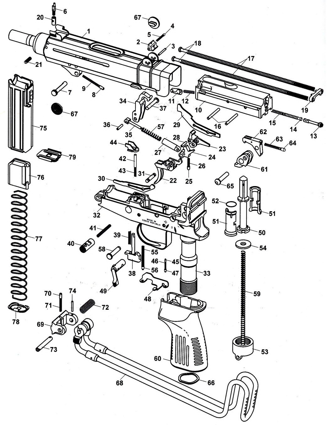 “蝎”式冲锋枪结构简单,生产容易。上机匣由钢板冲压而成,主要是连接枪管和容纳枪机;下机匣也是用钢机加而成,包括手枪形握把、击发机构和弹匣座。