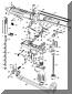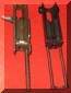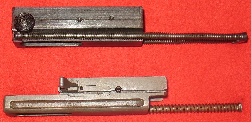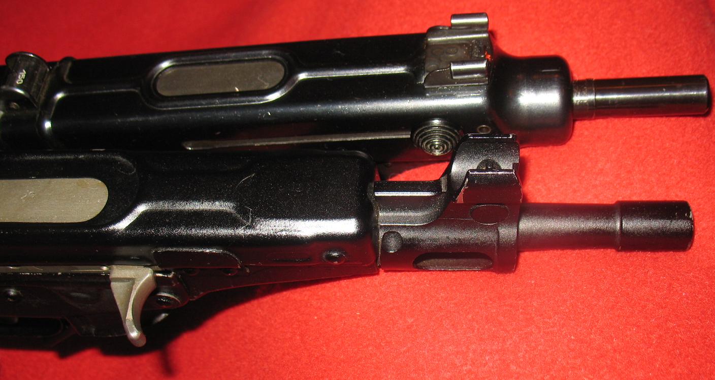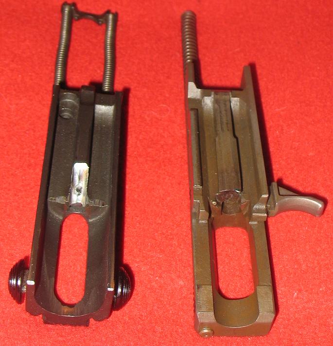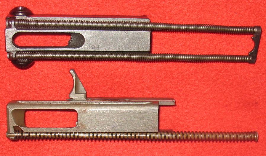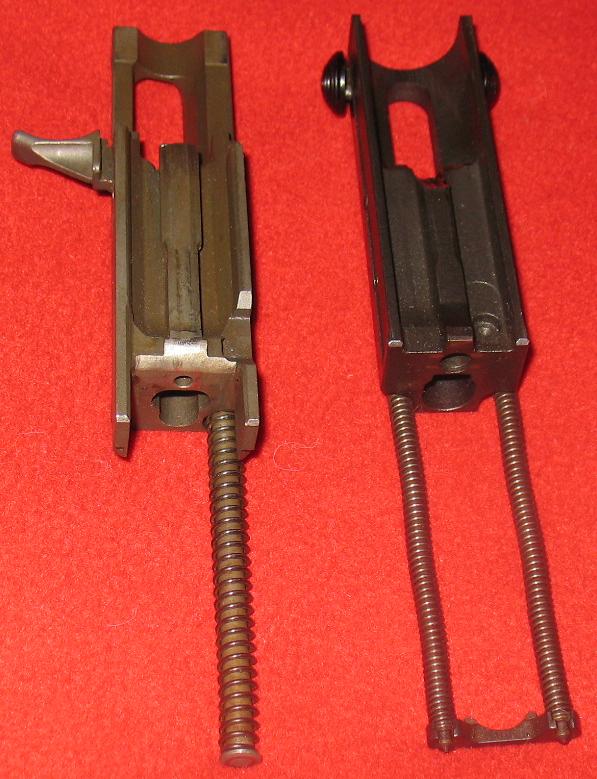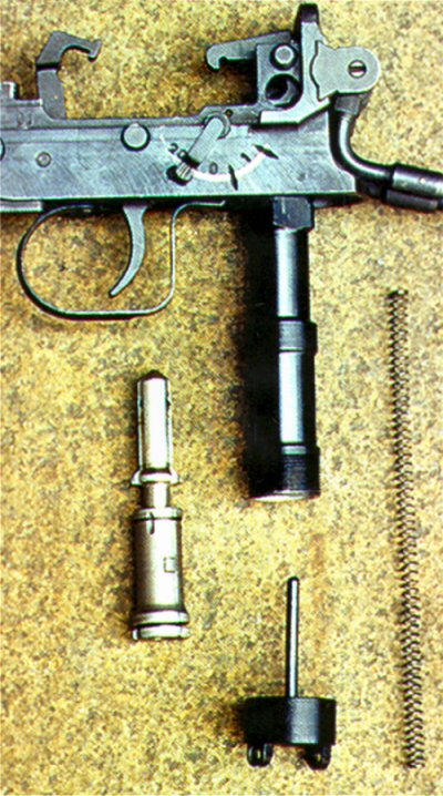 减速器由装在机匣尾部的弹簧挂钩和装在握把内的延迟装置组成。延迟装置是一个重量较大的惯性管,内部装有弹簧柱塞。当枪机后座到位时,它一方面撞击弹簧挂钩并被挂钩所挂住,另一方面又同时把弹簧柱塞压入握把之中。由于弹簧柱塞的重量轻,容易加速,所以向下运动的速度比惯性管的快得多,很快就穿过惯性管。随后,柱塞在其弹簧作用下回升并与仍在下降的惯性管相遇,这样柱塞的上升运动就受到延迟。当弹簧柱塞上升至最高位置时,它便撞击弹簧挂钩,弹簧挂钩转动而释放枪机。枪机复进,开始一个新的自动循环。