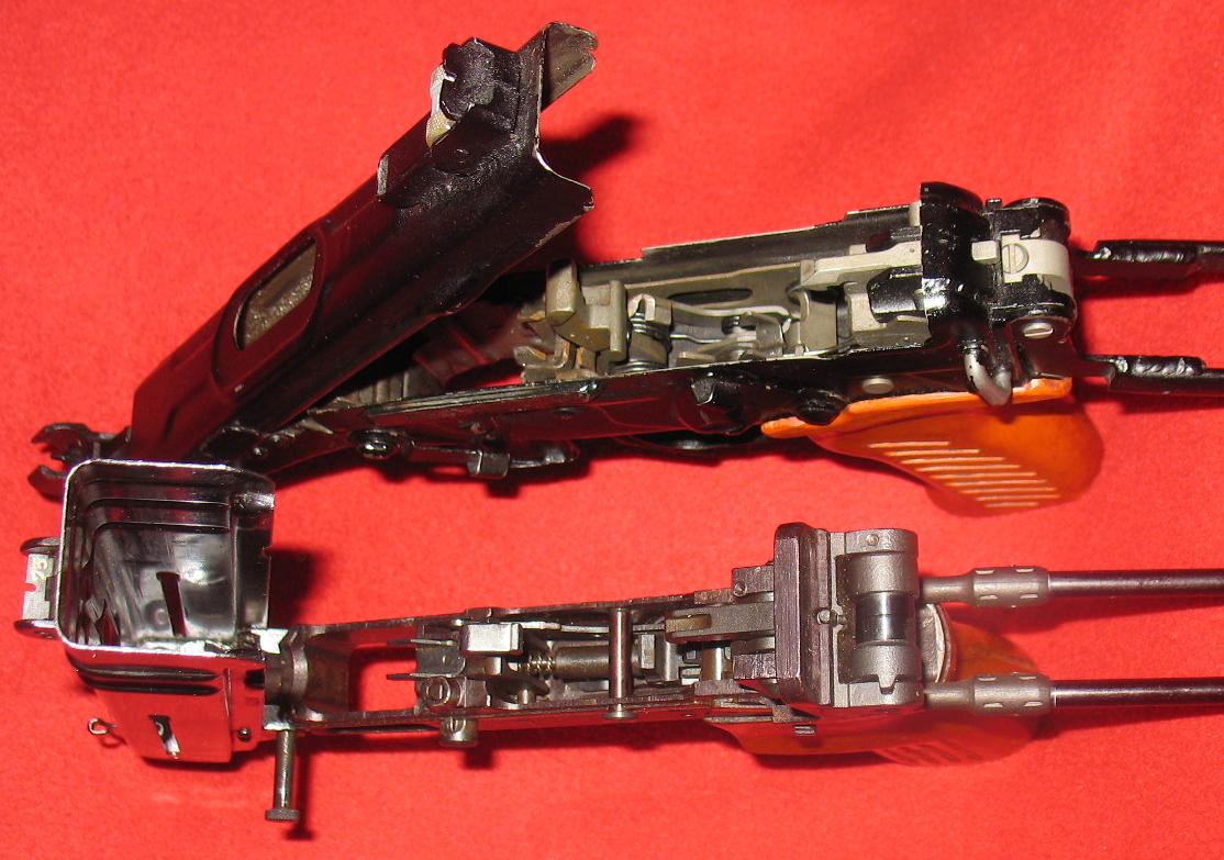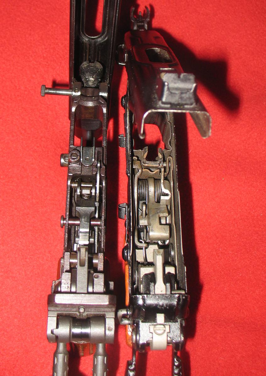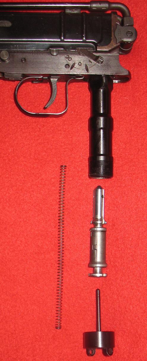 分解时,抽出机匣左侧、弹匣前方的连接销,向前推机匣约6mm,将机匣连同枪管一起卸下;分别取下机匣两侧的机柄,从机匣后方分解出枪机、复进簧及导杆。通常不完全分解到此为止,进一步的分解还包括从握把底部卸下减速器惯性管、拔出发射机座固定销、取下发射机座等。