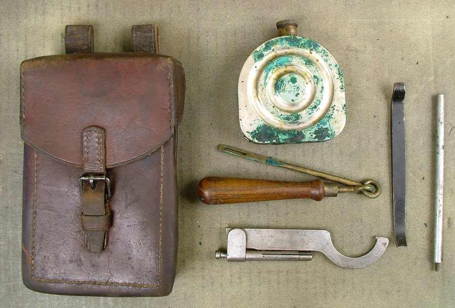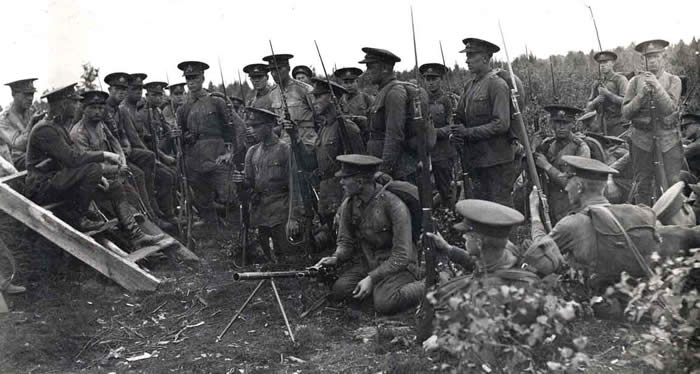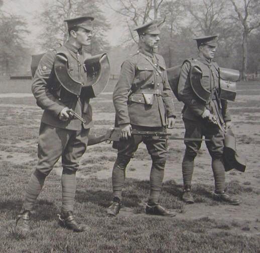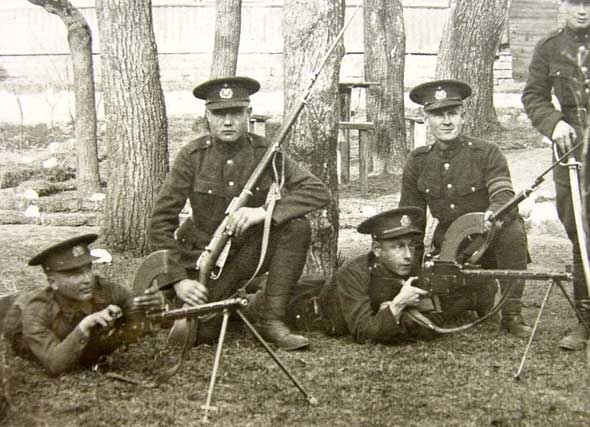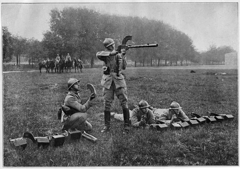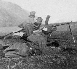 一个麦德森机枪小组,包括一名射手与两名弹药手,弹药手使用专门的皮制弹匣包携带弹药