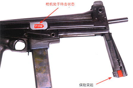 前握把折叠时,前握把上的保险突起将枪机锁定,起到保险作用