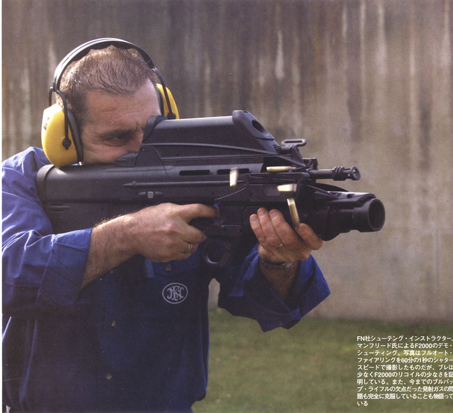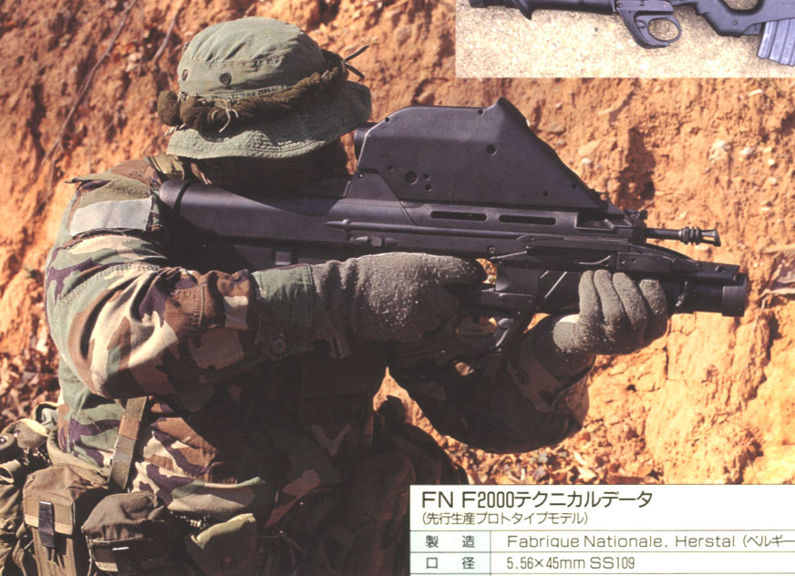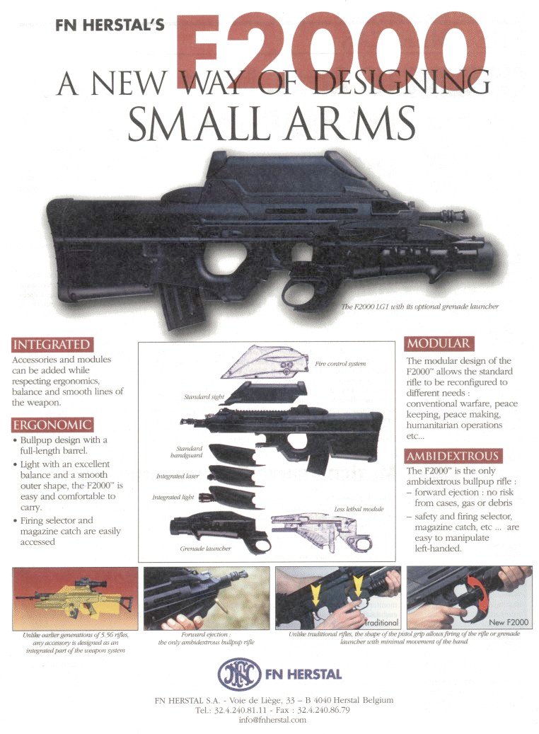 F2000的设计在2001年全部完成,带榴弹火控系统的型号也将在其后的两年里完成。目前已经少量装备部队,包括比利时军队和其他国家都是少量采购。在F2000的研制过程中,FN公司在成本、工艺性及人机工程方面下了功夫。经综合设计,F2000的重量较小,平衡性很好,易于携带、握持、使用,同样也便于左撇子使用。使用光学瞄具瞄准容易,即使在昏暗环境下,目标图像也比较清晰。前抛壳使点射时没有弹壳抛出。连发射击时,枪身很平稳,后坐力没有想像中的5.56mm口径步枪那么大,简直可以忽略不计。带榴弹发射器的F2000也很容易使用,因为扳机的位置很自然,接近于步枪扳机,装填榴弹并不像其他榴弹发射器那样困难,即使用机械瞄具,榴弹发射器也很好用。FN公司在此榴弹发射器的基础上,发展出Mk13 EGLM榴弹发射器。