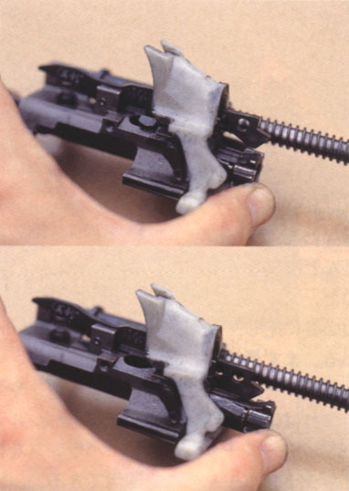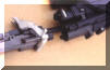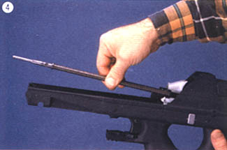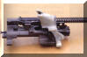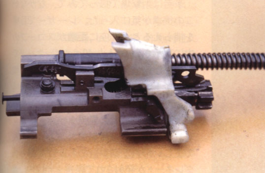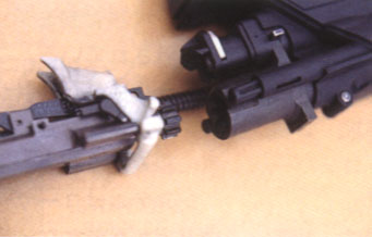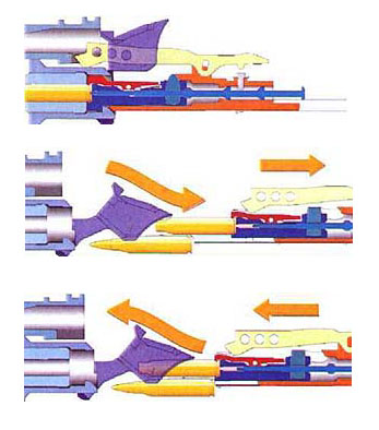 闭锁头(locking head)上有一个非同寻常的机构——摇臂系统(rocker)。为了便于向前抛壳,空弹壳从弹膛抽出 之后被送到在枪管上方运动的抛壳管中,这个动作通过该独特的摇臂系统来 完成。空弹壳抽出之后,它被摇臂系统 所固定,随着摇臂系统的翻转动作,空弹壳上抬,为下一发弹让出供弹路线,当下一发弹进入弹膛后,空弹壳便被送进了抛壳管。这种结构,点射射击前几发弹时,弹壳将不被抛出,只有当抛壳管中容纳多于3或4个空弹壳时,第1个空弹壳才被抛出。