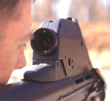 F2000可为40mm榴弹发射器配备常规类型的翻转式机械瞄具,但这种瞄准方式降低了榴弹性能,因为它有测距误差,因此FN公司又采用了简单的火控系统。F2000人控系统安装在框座位置,可用于步枪瞄准,但其主要功能是精确测量并显示目标的距离。将瞄准点对准目标,按一下位于扳机下方的按钮,即可启动一个低功率的激光测距仪,距离便以红色显示在瞄具显示屏上,误差为1米。将步枪向上倾斜一定角度,光的颜色便变成绿色。如果射手想以腰际射击方式发射榴弹,位于人控系统框座顶部的一个部件上将发出3种深色红/绿光,以便于瞄准。框座顶上还有距离修正钮,进行风偏修正。