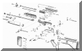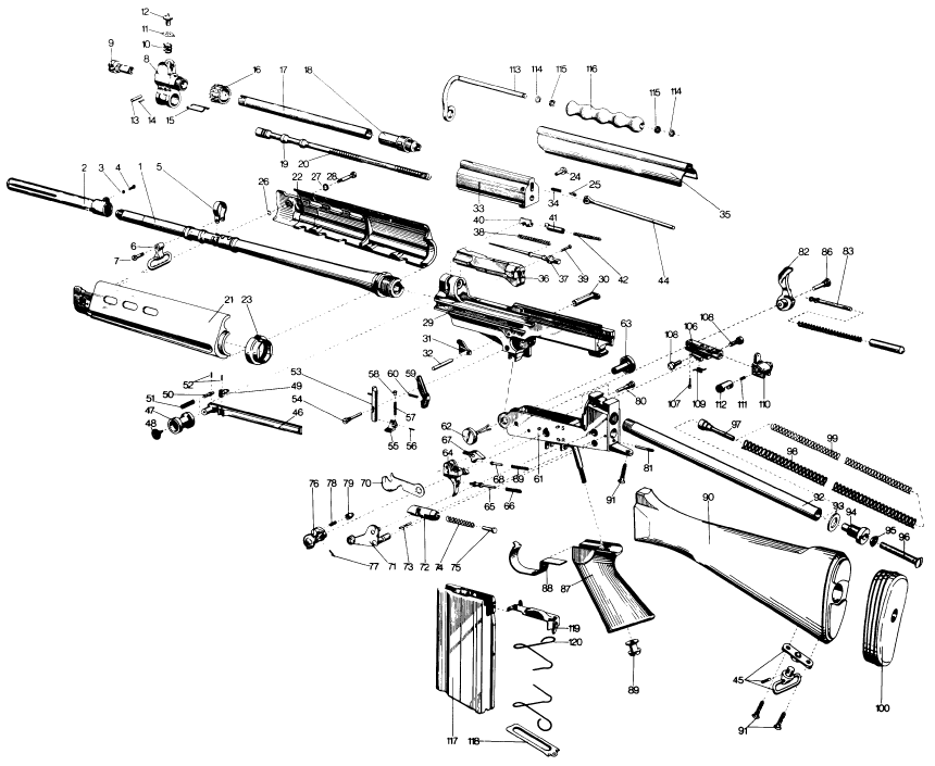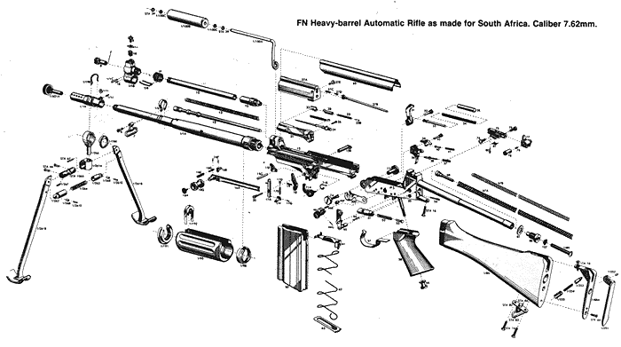 立体的FAL结构图,从左到右分别为公制式FAL标准型、英制式FAL标准型、公制式FAL轻机枪型、公制式FAL伞兵型。零件说明请对应下面的平面图说明
