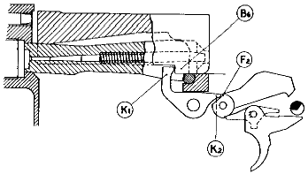 在上述过程中,保险阻铁的前端K1被机框底部的凸笋B6压下,使其尾端K2与击锤轴的前卡槽F2解脱。同时,由于机框复进到位,击针尾端得以露出。此时击锤方可打击到击针。